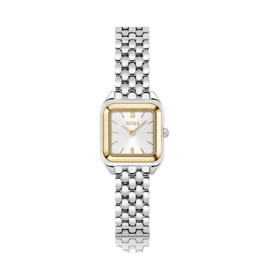 Die BOSS Damenuhr Mae Petite in Silber und Gold vereint schlichte Eleganz mit moderner Raffinesse. Das eckige Edelstahlgehäuse mit goldfarbener Lünette umrahmt ein silberfarbenes Zifferblatt mit goldenen Akzenten.