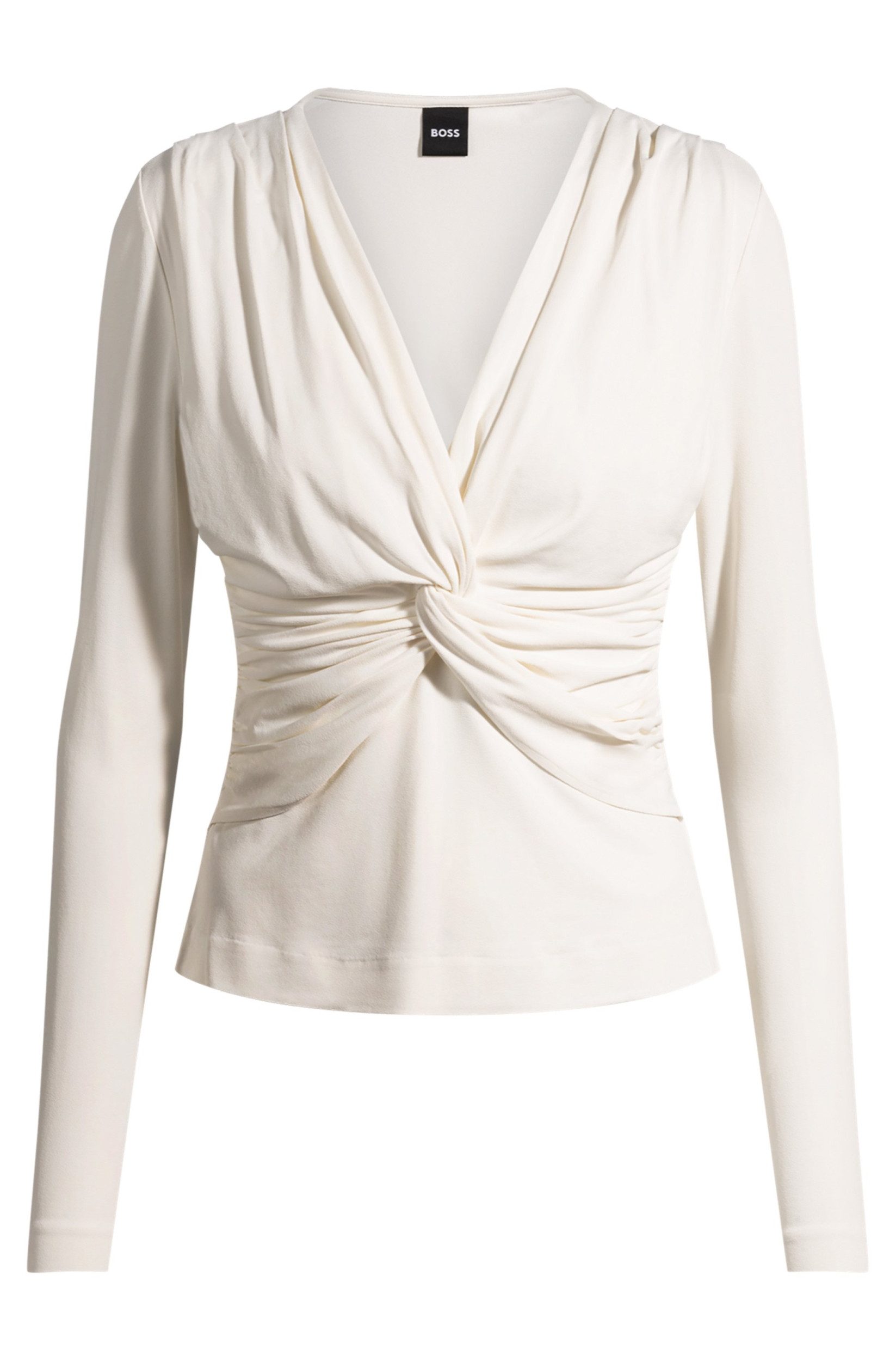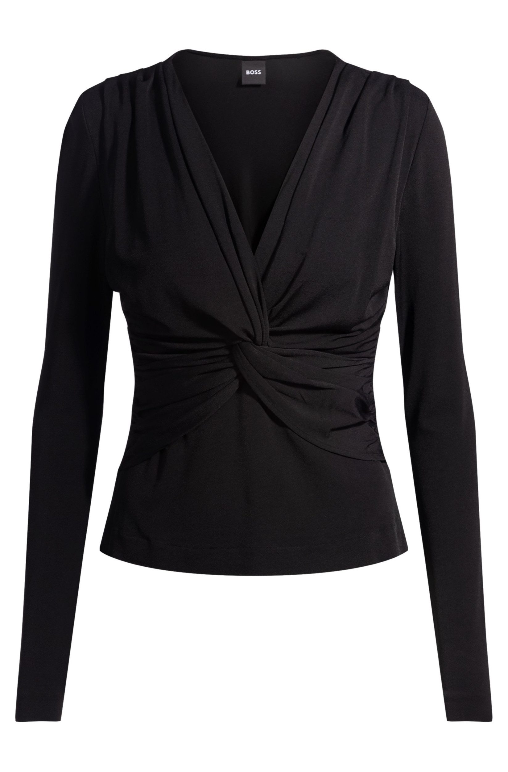 Verliebe Dich in den Komfort und Stil des Langarmshirts mit Twist-Front von EuloriStell Dir vor, Du könntest Eleganz und Bequemlichkeit in einem einzigen Kleidungsstück vereinen. Das Langarmshirt mit Twist-Front von Eulori, präsentiert von BOSS Black, macht genau das möglich! Dieses wunderschöne Top kombiniert eine feminine, eingedrehte Vorderseite mit dem Komfort von weichem Stretch-Jersey, sodass Du Dich den ganzen Tag über wohl und stilvoll fühlst.Sanft zur Haut, sanft zur NaturNicht nur Dein Komfort, sondern auch die Umwelt liegt uns am Herzen. Das Langarmshirt ist aus 91% Viskose und 9% Elasthan gefertigt, wobei die Viskose aus Zellulosefasern besteht, die aus nachhaltig bewirtschafteten Wäldern gewonnen werden. Trage es mit dem Wissen, dass Du einen Beitrag zum Schutz unserer Wälder leistest.Perfekt für jeden AnlassOb für das Büro, ein entspanntes Treffen mit Freunden oder einen besonderen Abend, dieses unifarbene Langarmshirt mit elegantem V-Ausschnitt passt sich mühelos jeder Situation an. Die Stretch-Qualität sorgt dabei für eine optimale Passform und Bewegungsfreiheit.Stil, der sprichtDie Twist-Front verleiht dem Shirt eine einzigartige Note, die sicherstellt, dass Du aus der Masse herausstichst. Kombiniere es mit Jeans für einen lässigen Look oder mit einer schicken Hose für eine formellere Gelegenheit – die Möglichkeiten sind endlos. Elegantes Design mit Twist-Front Weicher, stretchiger Jersey für maximalen Komfort Umweltfreundlich durch nachhaltige Materialien Vielseitig kombinierbar für jede Gelegenheit Stilvolles unifarbenes Muster mit V-AusschnittErlebe selbst, wie das Langarmshirt mit Twist-Front von Eulori Deinen Alltag bereichert und Dir ein Gefühl von Luxus und Verantwortung verleiht. Ein Must-Have in jedem Kleiderschrank!