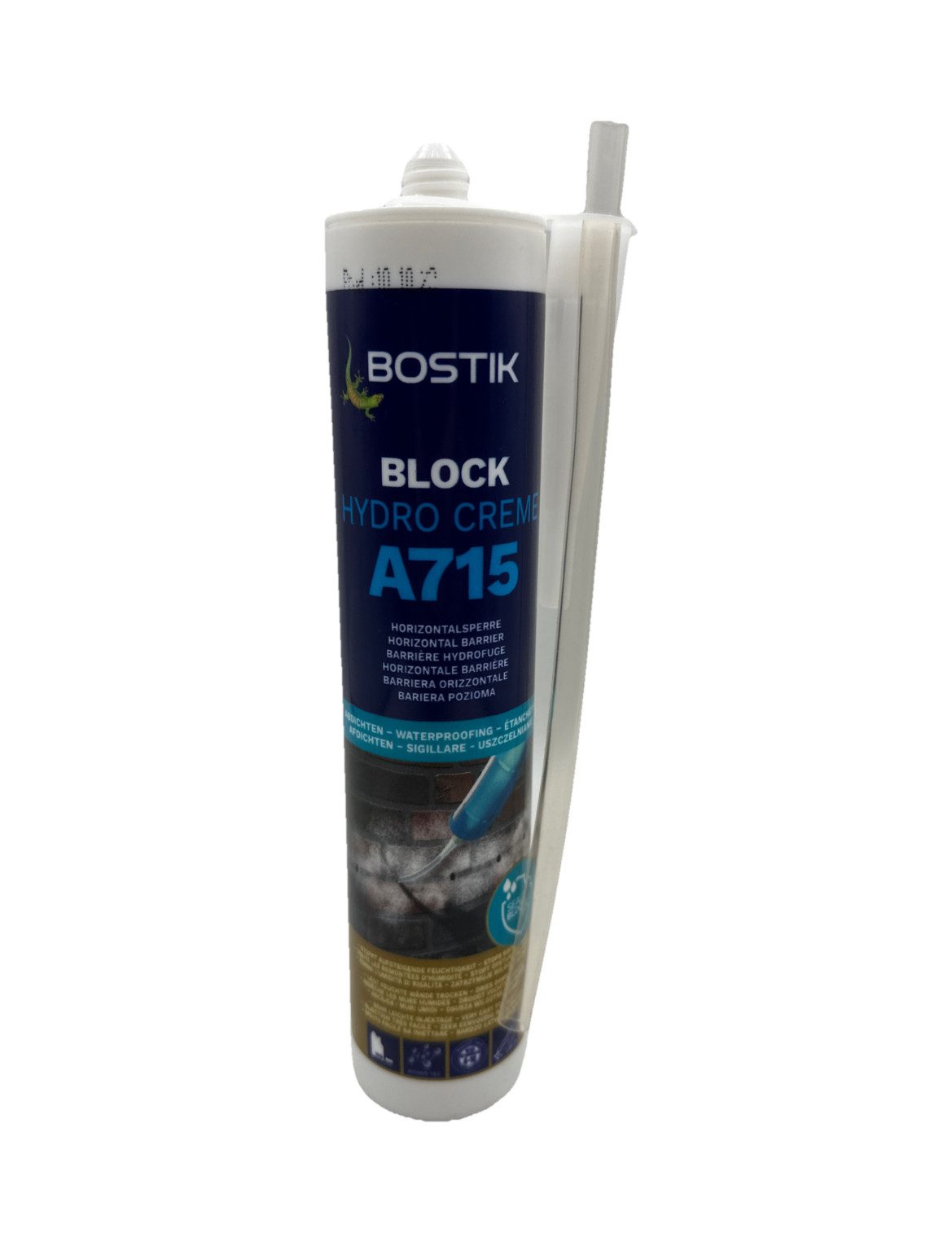 BLOCK A715 HYDRO CREME ist ein sehr hochwertiges und ergiebiges Produkt zum Erstellen einer Horizontalsperre auf Silan- / Siloxan-Basis. Ein optimales Ergebnis erzielt man bei der Anwendung in der Lagerfuge eines Mauerwerkes. Einfache und schnelle Anwendung in der Kartusche. Bei aufsteigender Feuchtigkeit zum Erstellen einer Horizontal-sperre BLOCK A715 HYDRO CREME tropft nicht. Einmaliges Auffüllen der Bohrlöcher mit BLOCK A715 HYDRO CREME ist ausreichend. Eine Bohrlochreihe genügt. PRODUKTBESCHREIBUNG BLOCK A715 HYDRO CREME ist ein sehr hochwertiges und ergiebiges Produkt zum Erstellen einer Horizontalsperre auf Silan- / Siloxan-Basis. Ein optimales Ergebnis erzielt man bei der Anwendung in der Lagerfuge eines Mauerwerkes. Einfache und schnelle Anwendung in der Kartusche. ANWENDUNGSBEREICHE Bei aufsteigender Feuchtigkeit zum Erstellen einer Horizontalsperre BLOCK A715 HYDRO CREME tropft nicht. Einmaliges Auffüllen der Bohrlöcher mit BLOCK A715 HYDRO CREME ist ausreichend. Eine Bohrlochreihe genügt. VORBEREITUNG DES UNTERGRUNDES Zur Fugensichtbarkeit Farbe, Putz oder Ähnliches entfernen. Die Bohrlöcher in einer Fuge ca. 15 cm oberhalb des Erdreichs setzen. Bei der Anwendung im Kellerbereich die erste Fuge oberhalb des Fußbodens wählen. Beim Einsatz in Kelleraußenwänden sollte eine intakte Außenabdichtung gewährleistet sein. Bei nachträglich ausgeführten Innenabdichtungen der Kelleraußenwände ist die nachträgliche Horizontalsperre oberhalb des erdberührten Bereiches einzubauen. Die Löcher mit einem Durchmesser von 12 mm, im Abstand von höchstens 12,5 cm, direkt in die Fuge bohren. Die Bohrlochtiefe rechnet sich aus der Wandstärke abzüglich ca. 15 mm. Den Bohrstaub aus den Bohrlöchern entfernen. VERARBEITUNG Den beiliegenden Injektionsschlauch auf die Kartuschenspitze stecken und das Bohrloch komplett mit BLOCK A715 HYDRO CREME füllen. Die Bohrlöcher sollen nach der Trocknung mit einem wasserdichten Mörtel z. B. RENO C788 FILL TURBO verschlossen werden. LAGERUNG BLOCK A715 HYDRO CREME muss frostfreigelagert werden. Im verschlossenen Originalgebinde und bei sachgerechter Lagerung ist BLOCK A715 HYDRO CREME mindestens 24 Monate haltbar.
