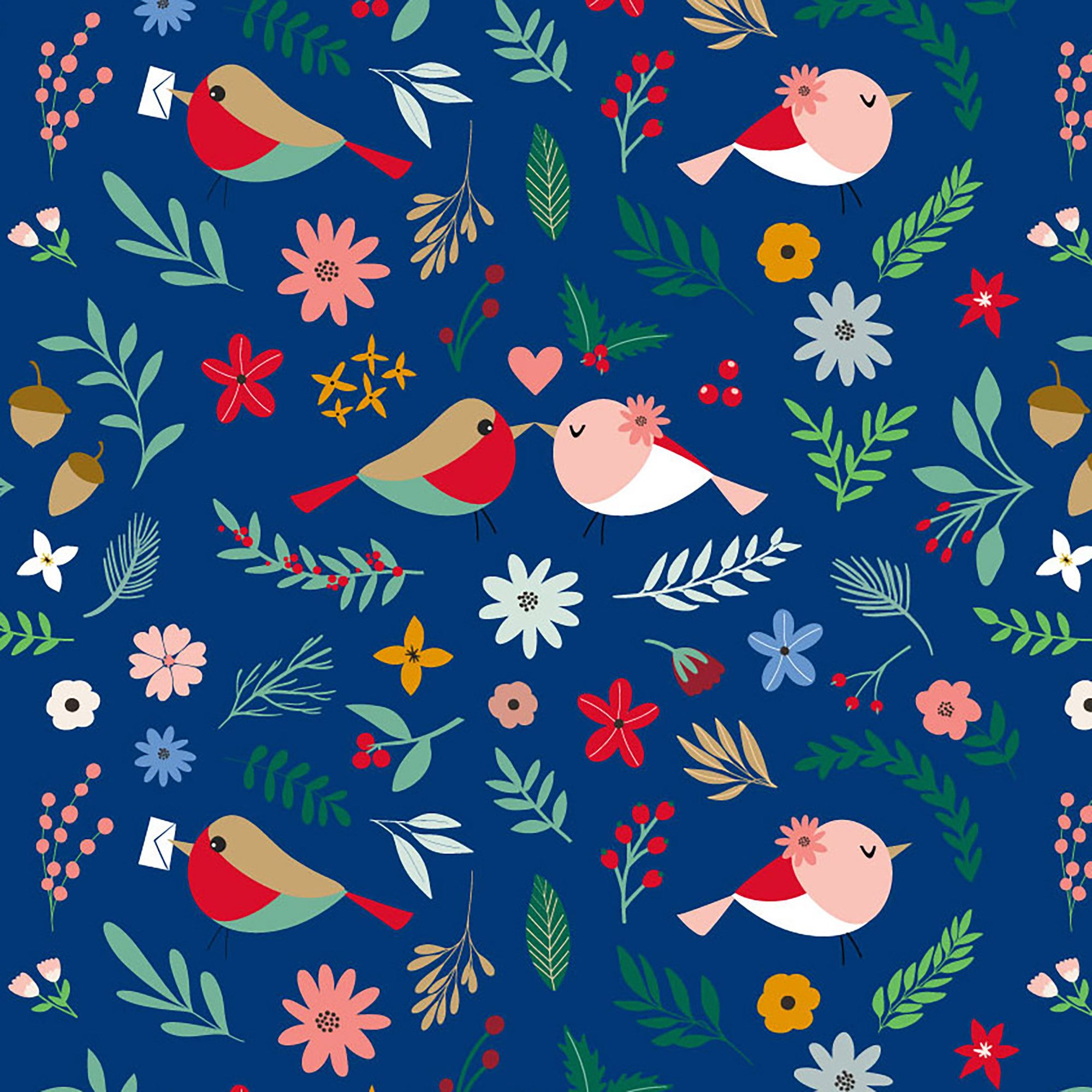 Mit diesem Papier machen Ihre Geschenke nicht nur zu Weihnachten eine gute Figur. Das edle dunkelblaue Motiv mit vielen floralen Elementen ist nicht nur dekorativ, sondern erzählt auch eine kleine Liebesgeschichte. Der Vogel schreibt seiner Liebsten Briefe, bis sie schließlich zusammenkommen. Das feste 90 g Papier aus reinem Recyclingpapier hat eine natürlich matte Optik und eignet sich auch sehr gut zum Basteln. Da es keine Beschichtung hat, lässt es sich einfach im Papiermüll recyceln. Maße: 69 cm x 48 cm