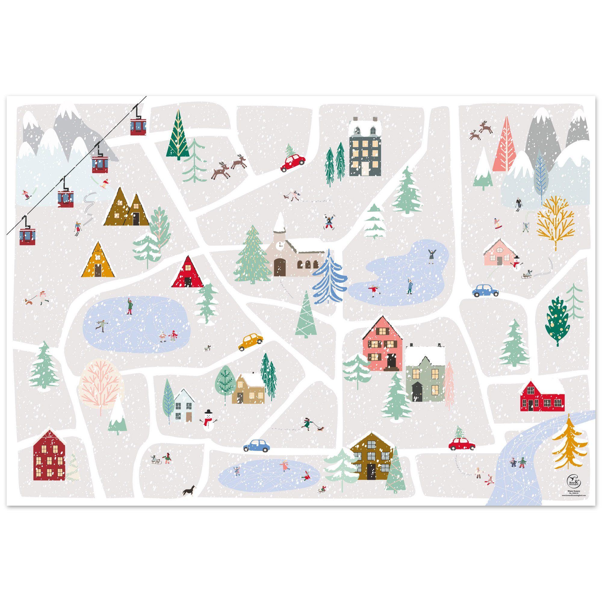 Mit diesem Geschenkpapier aus 100 % Recyclingpapier können Sie Ihre Geschenke winterlich verzaubern! Ihren Lieben wird hier beim Auspacken sicher nicht langweilig, da es auf der Winterlandschaft jede Menge zu entdecken gibt. Verschneite Häuser, Skifahrer, Schneemänner und Kinder, die Schlitten fahren oder einen Schneeengel machen sind nur einige Bespiele. Das feste 90 g Papier aus reinem Recyclingpapier hat eine natürlich matte Optik und eignet sich auch sehr gut zum Basteln. Da es keine Beschichtung hat, lässt es sich einfach im Papiermüll recyceln. Maße: 69 cm x 48 cm