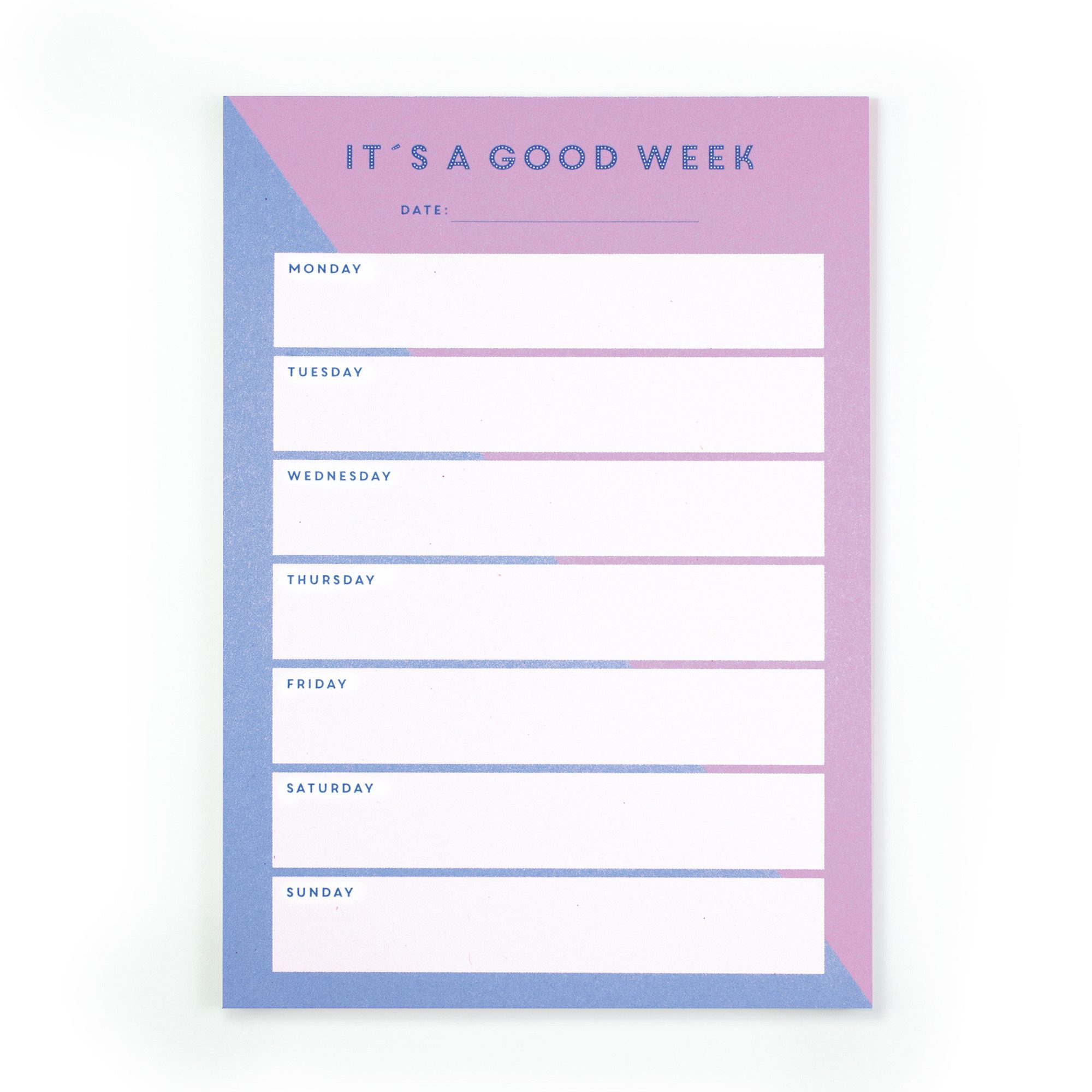 Notizblock A6 „It´s a good Week“ – Эко-товарer Wochenplaner in Lila/Blau Entdecke unseren stylischen DIN A6 Wochenplaner "It's a good week"! Mit seinem einzigartigen diagonalen Design in lebhaftem Blau und Lila bringt dieser Planer frischen Schwung in deinen Alltag. Im Vordergrund findest du schlicht weiße Textblöcke mit Wochentagen versehen, die ausreichend Platz für deine wöchentlichen Aufgaben, Termine und To-Dos bieten. Egal, ob im Büro, in der Uni oder unterwegs – dieser Wochenplaner ist der perfekte Begleiter, um deine Woche organisiert und produktiv zu gestalten. Hol dir jetzt deinen "It's a good week"-Planer und starte jede Woche mit einem Lächeln! - Handliches Format für den Schreibtisch oder unterwegs - Hochwertiges Papier für angenehmes Schreiben - Ideal für Büro, Schule oder den Alltag - Ein zuverlässiger Begleiter für alle, die nichts vergessen möchten. Der Block besteht aus 50 Blatt bedrucktem Recyclingpapier in fester 100 g Qualität und einer stabilen Rückwand aus recycelter Pappe. Er ist klimaneutral bedruckt mit veganen Bio-Farben auf Pflanzenölbasis. Maße: DIN A6