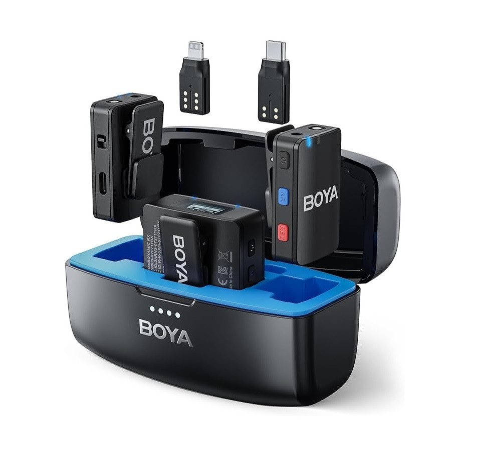 Lieferumfang | BOYAMIC TX+TX+RX mit Ladestation 2 Adapter: mit USB-C Stecker, mit Lightning-Stecker 3.5mm-Klinke TRS-to-TRS Kabel 2 Lavalier Mikrofone USB-C-Ladekabel 2x Fell-Windschutz Tragetasche |