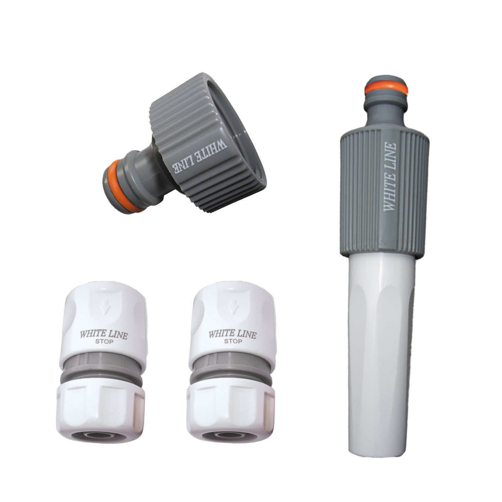 Dieses Gartenschlauch-Set umfasst einen Hahnverbinder mit 1-Zoll-Innengewinde für 3/4-Zoll-Wasserhähne sowie zwei Steckverbinder für einen 3/4-Zoll (19-20 mm) Gartenschlauch. Zusätzlich erhalten Sie eine Spritzdüse mit Wasserstopp und stufenloser Einstellmöglichkeit.