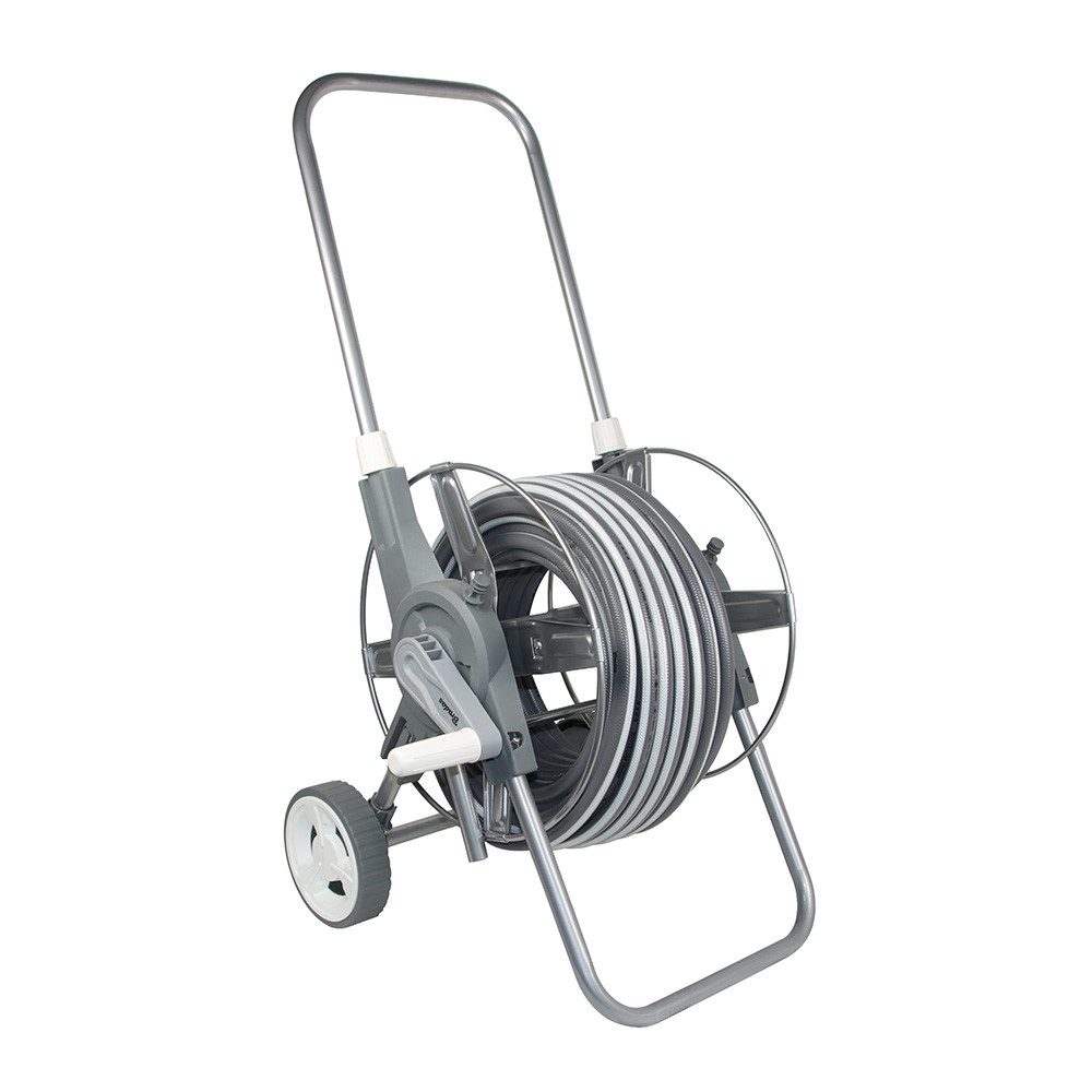 Der Schlauchwagen besteht aus einem robustem Metallgestell, welches langlebig und stabil ist, und aus schonenden Kunstoffrädern. Durch einen verstellbaren Griff bietet der Wagen Komfort in jeder Höhe. Ein drehbarer Adapter verhindert das Verdrehen des Schlauchs, während die Kurbel das Aufwickeln des Schlauchs erleichtert. Der Wagen kann insgesamt 60m von einem 1/2" Schlauch aufrollen.