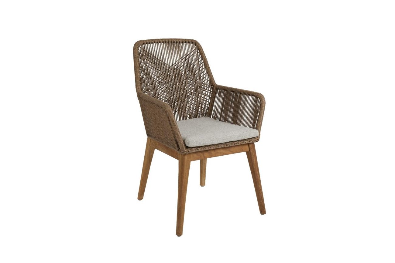 Der Gartenstuhl Hassel ist ein klassisch schönes Möbelstück für den Außenbereich. Das Gestell besteht aus Teakholz in Naturfarbe und verleiht dem Stuhl eine robuste und natürliche Ausstrahlung. Der Bezug aus Kunststoff-Rattan in Braun sorgt für ein modernes und zeitgemäßes Design und ist gleichzeitig sehr pflegeleicht und langlebig. Das Sitzkissen ist aus Olefin-Stoff gefertigt und bietet einen hohen Sitzkomfort. Olefin ist ein strapazierfä-higes Material, das gegenüber Witterungseinflüssen und UV-Strahlen beständig ist und ist somit optimal für den Einsatz im Freien geeignet. Das Kissen kann bei Bedarf einfach abgenommen und gewaschen werden. Der Gartenstuhl Hassel ist eine attraktive und prakti-sche Wahl für den Außenbereich und eignet sich perfekt für gemütliche Stunden im Freien.