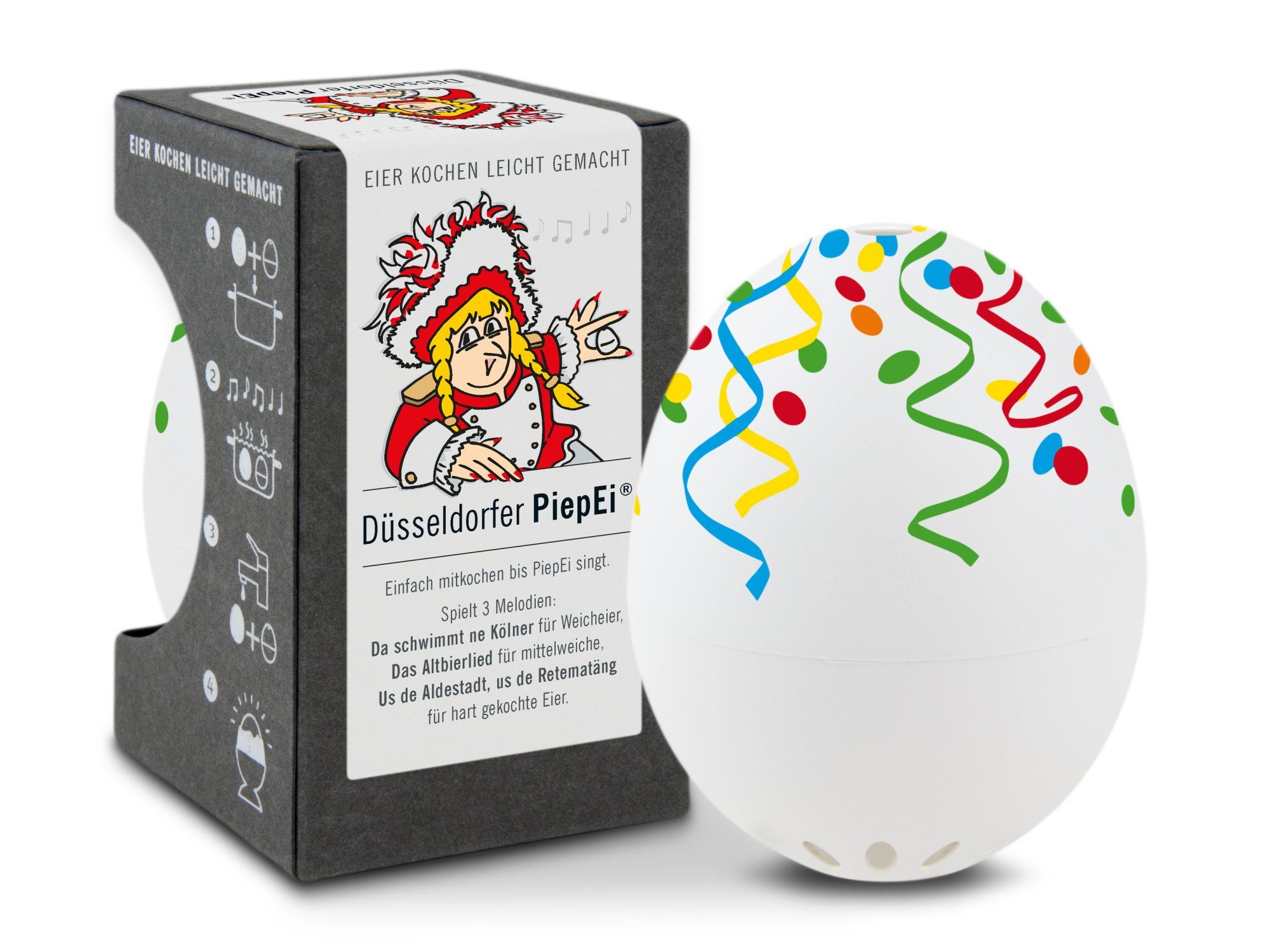 Wenn es „da schwimmt ne Kölner“ aus dem Kochtopf spielt schwimmt da zwar eigentlich nen Düsseldorfer PiepEi im Topf, aber da diese Städterivalität niemals enden wird, gibt es eben auch lustig, provokantes Liedgut auf dem karnevalistischen PiepEi für alle Düsseldorf Fans.   Zu weich, zu hart – aber nie auf den Punkt. Perfekt gekochte Eier sind eine Wissenschaft für sich. Für das Düsseldorfer PiepEi aber kein Problem. Einfach mit den Eiern lagern, zusammen mit den Eiern kochen und warten bis das Düsseldorfer PiepEi singt. Egal mit welcher Wassertemperatur man startet und egal auf welcher Höhe man kocht, das Ei wird perfekt (FAQ).   Genau das richtige Geschenk für alle Liebhaber der Rheinmetropole, ob nun Weichei oder harter Altbierveteran.