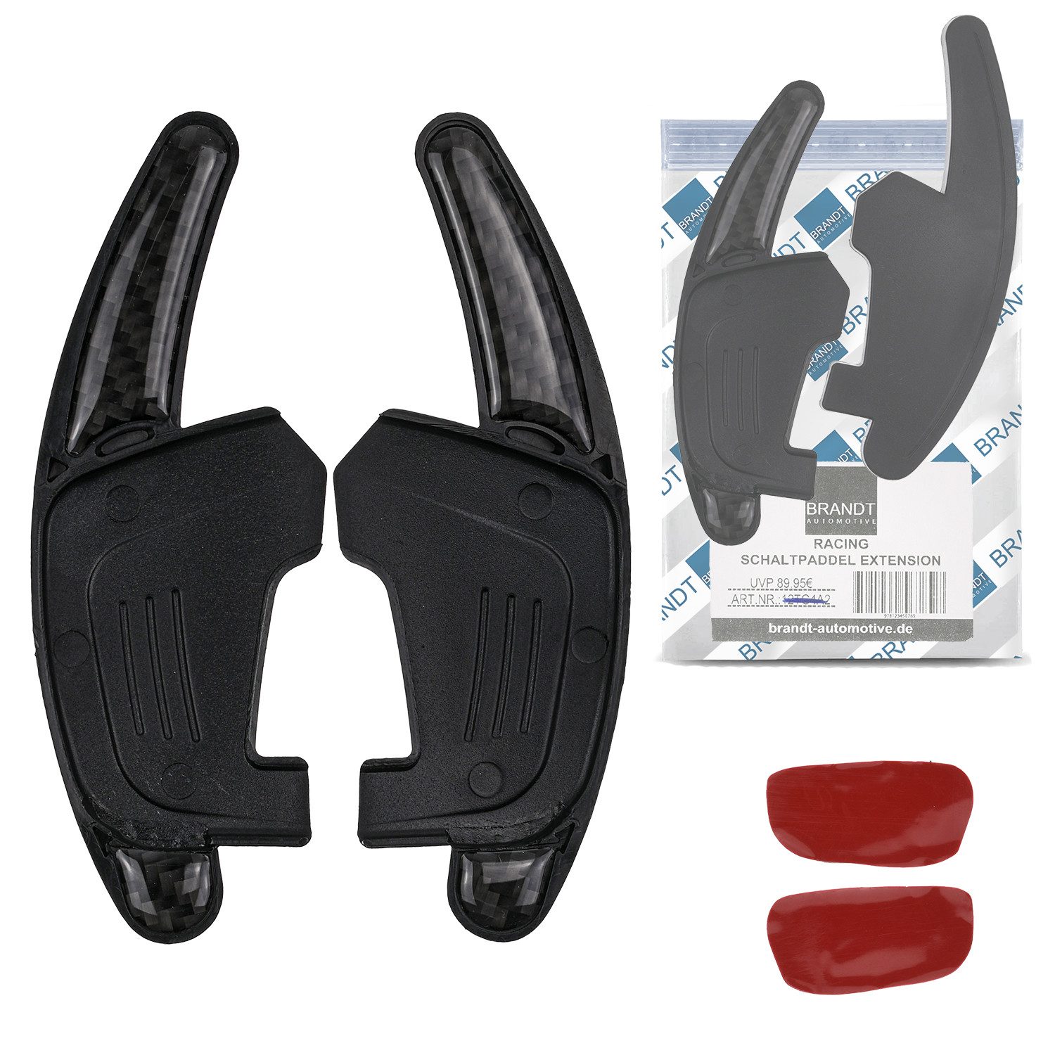 Lieferumfang | 1x BRANDT AUTOMOTIVE Schaltwippen Verlängerung (PAAR - CARBON OPTIK SCHWARZ) links (-) + rechts (+), 1x Acrylschaum (doppelseitige Hochleistungs) Klebepads |