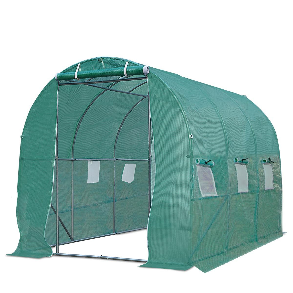 Ausstattung | UV-stabilisierte Spezial-Gitterschutzfolie Stahlverstrebungen doppelt feuerverzinkte Stahlrohre große Rohrdurchmesser selbstsichernde Schrauben und Korrosionsschutz Inklusive Erdanker Stahl-Bodenleisten Aufrollbare Türen und Fenster mit Mückennetzen für beste Belüftung überlappende Folienränder für zusätzliche Fixierung und Stabilität Hohe Durchgangshöhe und gebogenes Dach |