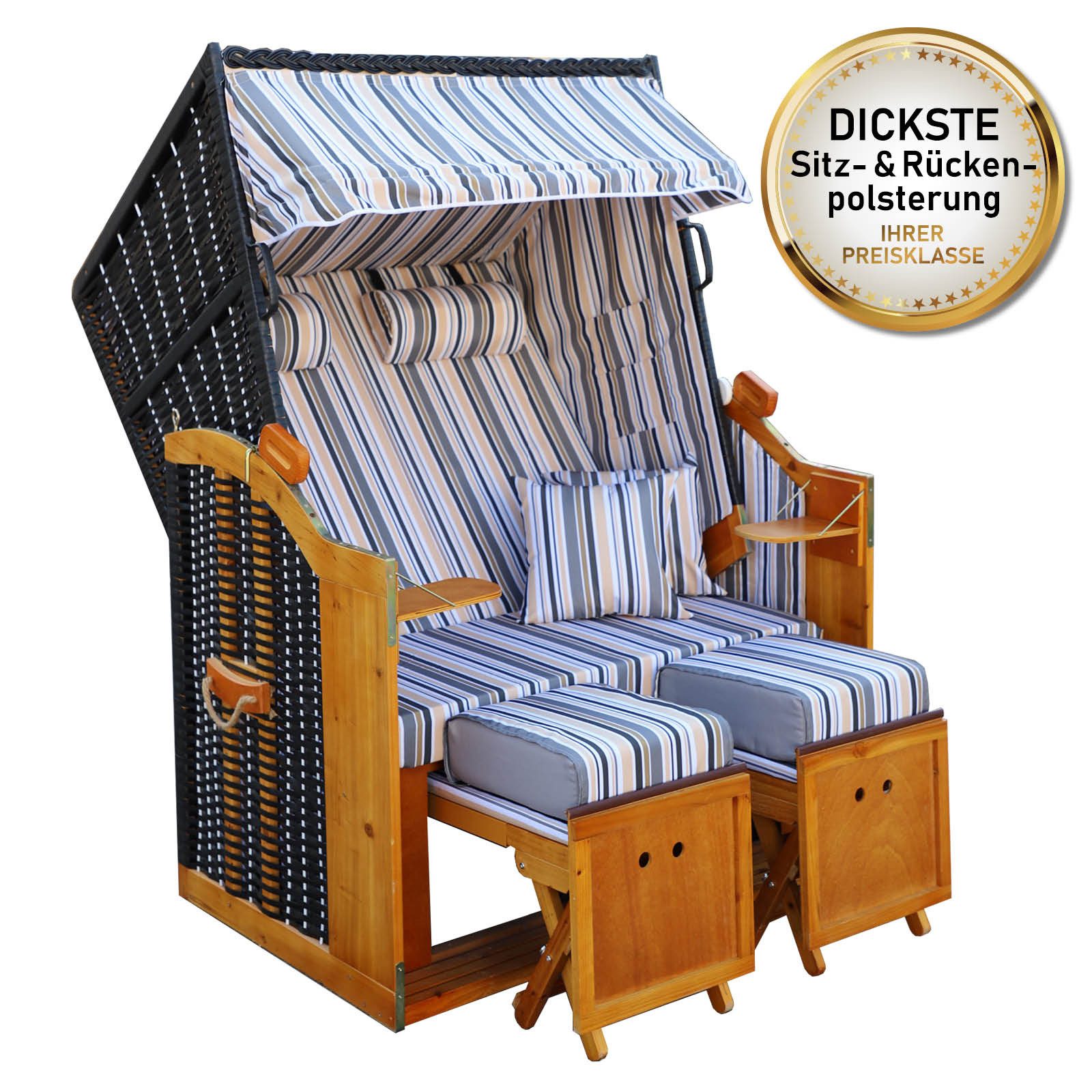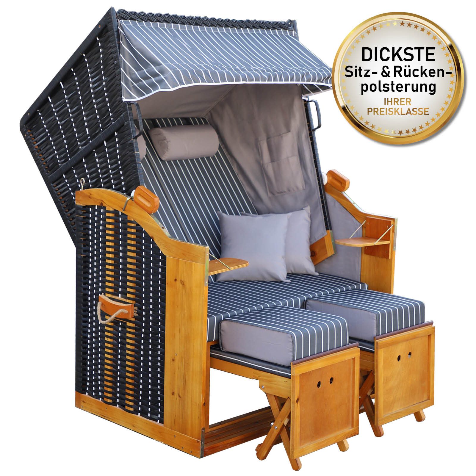 Eigenschaften | Der Strandkorb lässt sich in 4 Positionen bis zu 170° einstellen 30% dickerer Sitz- und 60% dickerer Rückenpolsterung in dieser Preisklasse innovative Fußstützen mit patentierter Schienentechnik dadurch leicht ausziehbar, höhenverstellbar und verlängerbar zwei ausklappbare Ablagetische & integrierte Markise Gefertigt aus atmungsaktivem, lasiertem Kernholz und wetterbeständigem, UV-resistentem Polyrattan |