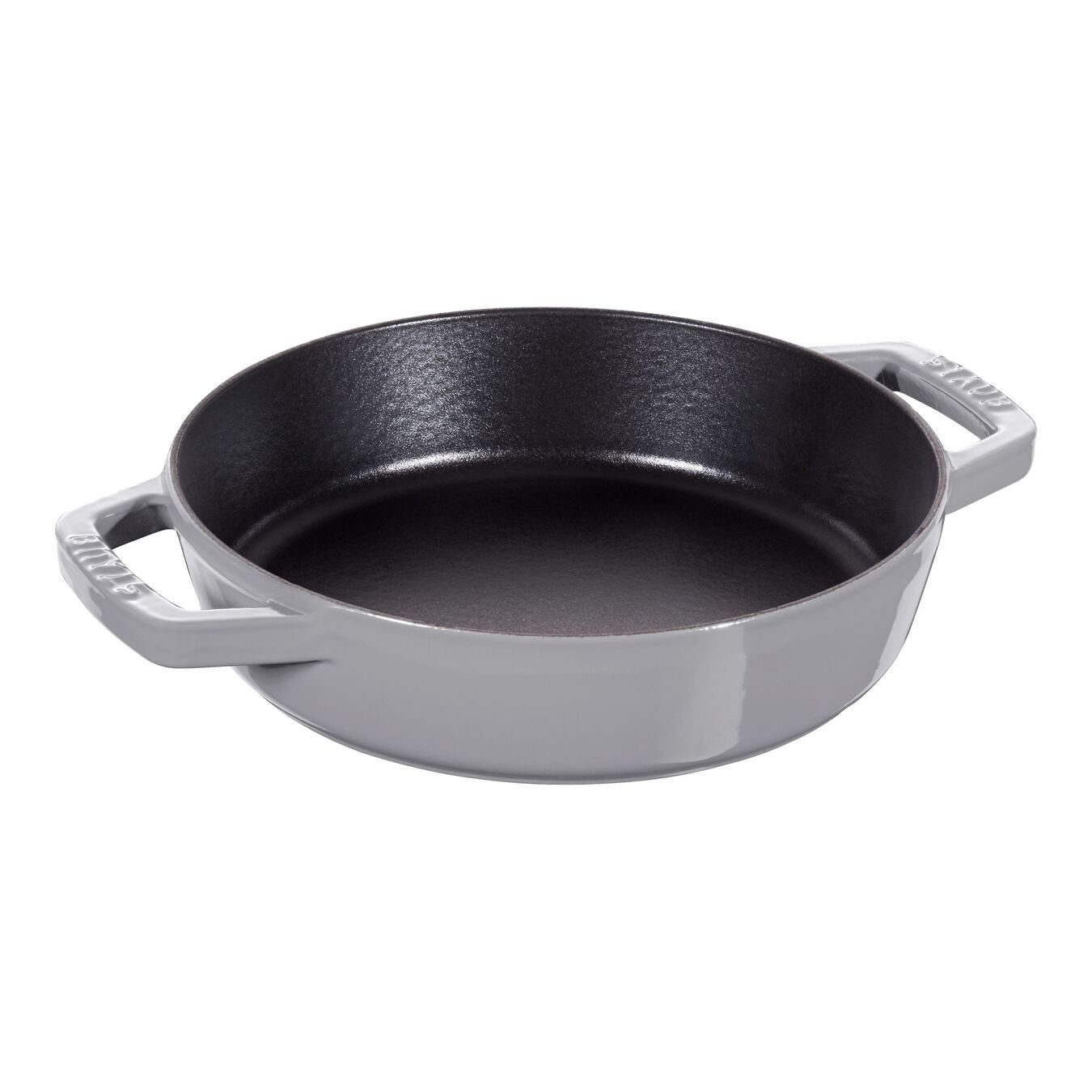 Staub Pans Bratpfanne mit 2 Griffen 20 cm, Gusseisen, Graphit-Grau Die Bratpfanne mit 2 Griffen von Staub erlaubt Ihnen scharfes Anbraten, sanftes Garen und anschließendes Überbacken zahlloser Speisen. Der glatte Innenboden in Schwarz verringert das Risiko von Anbacken und ermöglicht das Zubereiten fettarmer Speisen. Das ist besonders für schonendes Garen von Vorteil, das die Vitamine und Nährstoffe besser erhält, egal ob auf der Herdplatte oder im Backofen. Zudem lässt sich die glatte Beschichtung mit wenigen Handgriffen reinigen. Die Pfanne ist übrigens für alle Arten von Herden, einschließlich Induktionsherde, geeignet. Mit der Bratpfanne in Grau bringen Sie nicht nur köstliche Speisen, sondern auch ein ansprechendes Design auf den Tisch. Denn zum Servieren eignet sich die kompakte Pfanne ohne Probleme. Durch ihre dezente Gestaltung fügt sie sich harmonisch in die Tischdekoration ein, ganz gleich ob beim romantischen Dinner im Kerzenschein oder beim gemeinsamen Essen mit der Familie. Das Design der Bratpfanne mit einem Durchmesser von 20 cm ist an das der spanischen Paellapfanne angelehnt. Das spanische Gericht besteht aus einer Vielfalt an Produkten, die kunstvoll miteinander kombiniert werden. Reis, Gemüse, Fleisch, Fisch und Meeresfrüchte können aufgrund der hervorragenden Eigenschaften des Kochgeschirrs von Staub gut zubereitet werden: Dank einer effizienten Wärmespeicherung und Wärmeabgabe sowie einer Hitzeleitung bis in den Rand werden die Zutaten optimal gegart. So zaubern Sie mit der Pfanne aus der Serie Pans nicht nur spanische Gerichte mit viel Freude. Ermöglicht scharfes und krosses Anbraten. Perfektes saftiges und zartes Braten und Schmoren von Fleisch-, Fisch- und Gemüsepfannen. Ideal zum Впередgaren im Ofen. Für alle Herdarten inkl. Induktion geeignet, auch im Backofen/Grill einsetzbar. Eigenschaften Farbe: Graphit-Grau Hitzebeständigkeit: 240,00 ºC Kältebeständigkeit: -20,00 ºC Material: Gusseisen Griffart: Deckelgriff Veredelung: beschichtet Griffbefestigung: verschraubt Deckel vorhanden: Nein Induktion: Ja Backofen geeignet: Ja Gefrierschrank geeignet: Ja Herdplatten geeignet: Ja spülmaschinengeeignet: Ja Lieferumfang: 1 Abmessungen Gewicht netto: 1,67 kg Volumen: 1,25 l Produktlänge: 27,00 cm Produktbreite: 20,00 cm Produkthöhe: 5,00 cm Produkthöhe ohne Deckel: 5,00 cm Oberer Durchmesser: 20,00 cm Bodendurchmesser: 17,60 cm Grifflänge: 3,50 cm