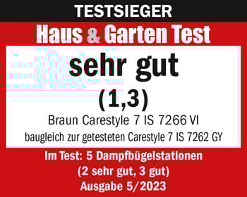 Das Modell Braun Carestyle 7 IS 7266 VI ist „baugleich mit dem getesteten Braun Carestyle 7 IS 7262 GY“. Dieses testet das Magazin „test“ der Stiftung Warentest im Vergleich mit insgesamt fünf Dampfbügelstationen. Die „sehr gute“ Funktion überzeugt u. a. mit einer sehr starken Bügelergebnis und einer hervorragenden Dampffunktion. Die sehr einfache Handhabung ist am besten. Das Gerät ist exzellent verarbeitet. Außerdem punktet die sehr hohe Sicherheit. Mit dem Gesamtergebnis „sehr gut (1,3)“ ist die Dampfbügelstation der „TESTSIEGER“.