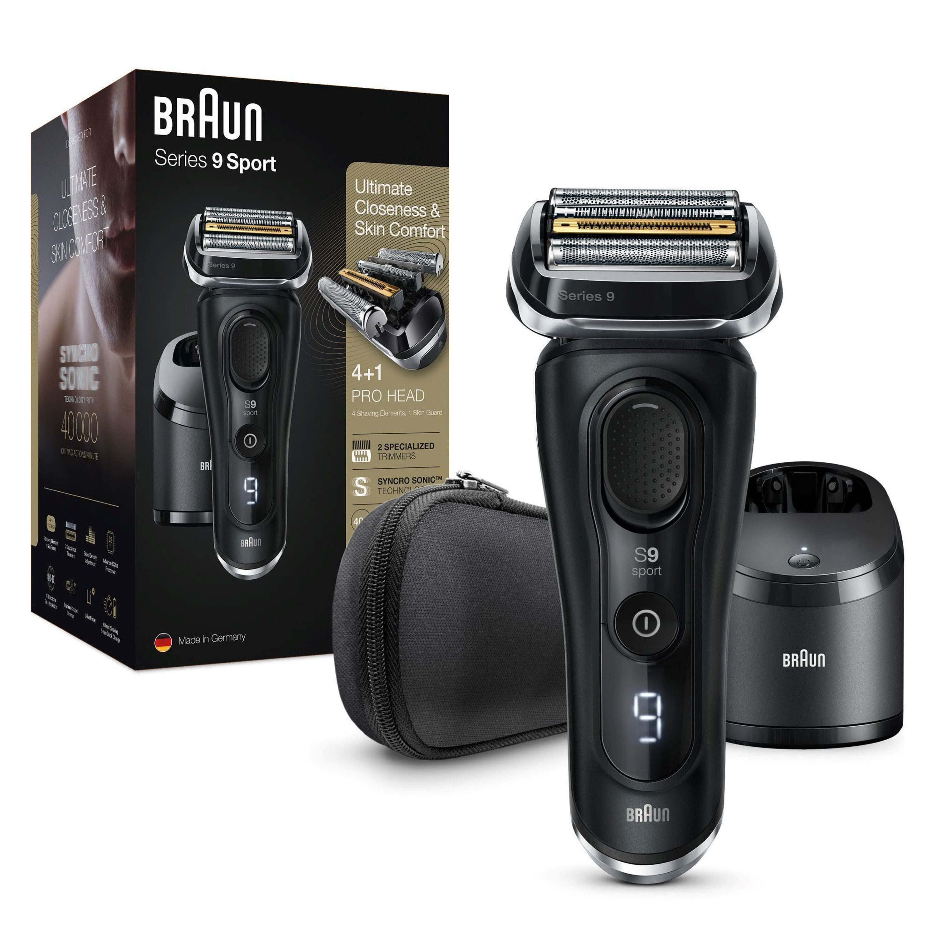Lieferumfang | Elektrorasierer Netzteil Reinigungs- und Ladestation Reinigungsbürste Reinigungskartusche Stoff-Reise-Etui |