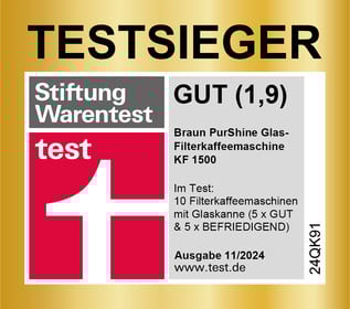 Das Magazin „test“ der „Stiftung Warentest“ testet den Braun PurShine KF1500 im Vergleich mit insgesamt zehn Filterkaffeemaschinen mit Glaskanne. Das „sehr gute“ Kaffeezubereitung ist am besten: Das Gerät arbeitet z. B. schnell und mit „sehr guter“ Kaffeestärke. Die Handhabung ist einfach. Außerdem erhält die hervorragende Haltbarkeit und Stabilität die Bestnote „1,0“. Mit dem Gesamtergebnis „GUT (1,9)“ ist das Modell der „TESTSIEGER“ und ein „PREISTIPP“.