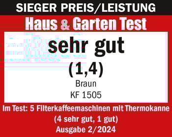 Die Braun KF 1505 erzielt im Vergleichstest des Magazins „Haus & Garten Test“ mit vier weiteren Filterkaffeemaschinen mit Thermokanne das Gesamtergebnis „sehr gut (1,4)“. Die „gute“ Kaffeetemperatur und die kurze Zubereitungsdauer überzeugen. Sowohl die Brühtemperatur als auch das Warmhalten erhalten die Bestnote „1,0“. Das Gerät ist einfach zu bedienen und sehr leicht zu reinigen. Außerdem ist es „sehr gut“ verarbeitet. Das Modell erreicht im Test zusammen mit zwei anderen Geräten das zweitbeste Gesamtergebnis und ist der „SIEGER PREIS/LEISTUNG“.
