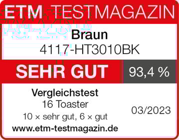 Das Testmagazin „ETM“ testet den Braun 4117-HT3010BK im Vergleich mit insgesamt 16 Toastern. Die sehr hohe Funktionalität überzeugt u. a. mit „sehr guter“ Bräunung und sehr hohem Tempo. Das Gerät ist sehr leicht zu handhaben. Es ist umfangreich ausgestattet und sehr gut“ verarbeitet. Außerdem punktet der besonders niedrige Stromverbrauch. Mit der Gesamtnote „sehr gut (93,4 %)“ erreicht der Toaster im Test Platz drei. .