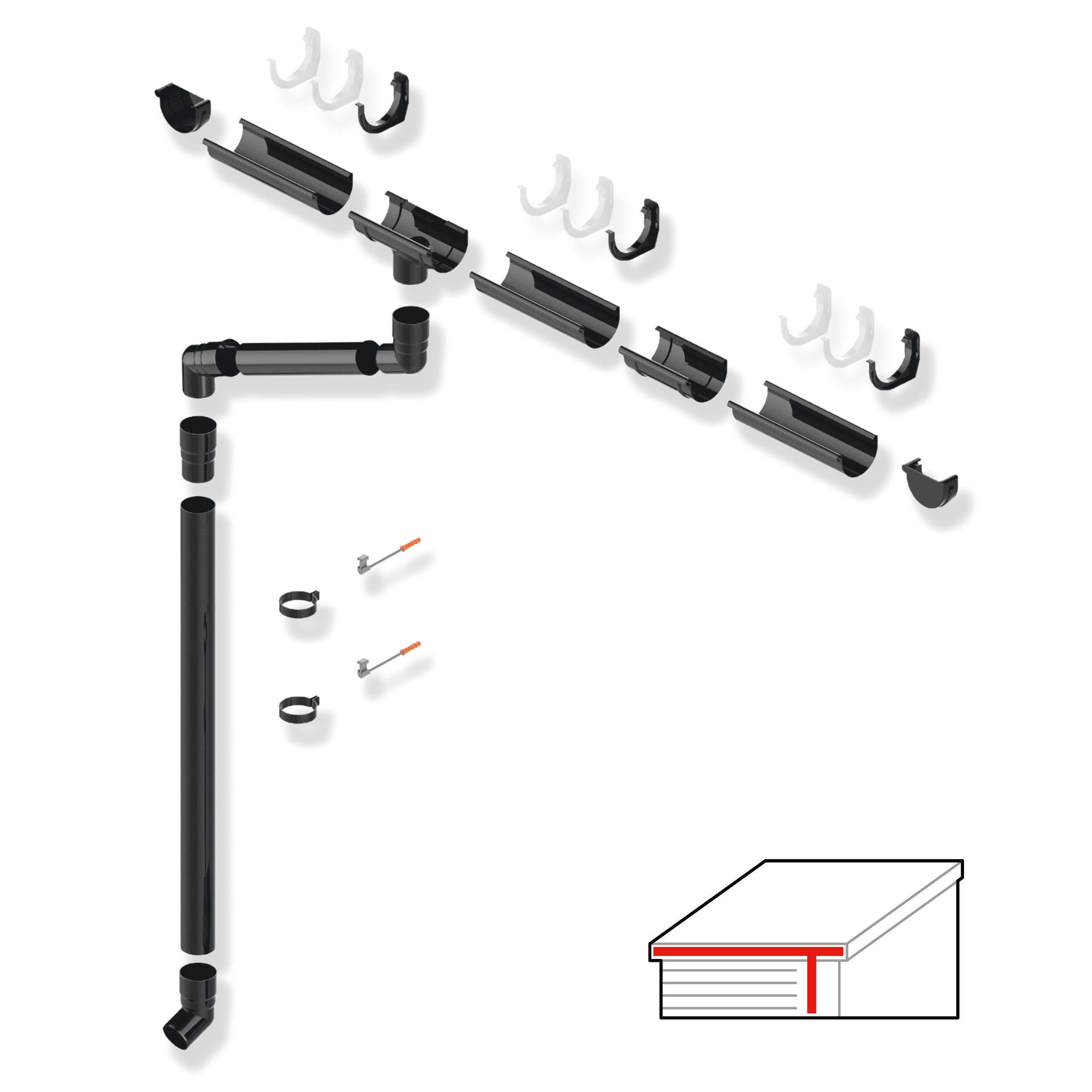 Lieferumfang | Dachrinne 2 m Rinnenhalter Rinnenboden rechts Rinnenboden links Rinnenverbindung Ablaufrichter Fallrohr 2m Fallrohrmuffe Bogen Fallrohrschelle PVC Ringschraube für Fallrohrschelle 180 mm |