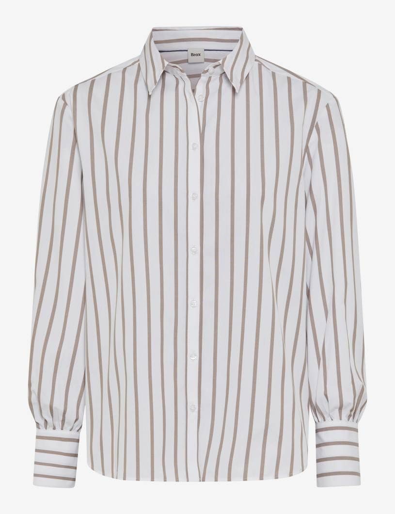 Die Brax Style Vic Hemdbluse kombiniert klassische Eleganz mit modischen Akzenten. Die gerade Silhouette und der zeitlose Hemdkragen verleihen ihr eine klare Linie, die durch den modischen Längsstreifen betont wird. Zarte Raffungen im Rückenteil setzen feminine Details. Die dezente Knopfleiste und die breiten 1-Knopf-Manschetten runden das Design ab. Gefertigt aus hochwertiger Popeline-Qualität aus reiner Baumwolle bietet die Bluse ein angenehmes Hautgefühl, natürliche Atmungsaktivität und langlebige Strapazierfähigkeit.
