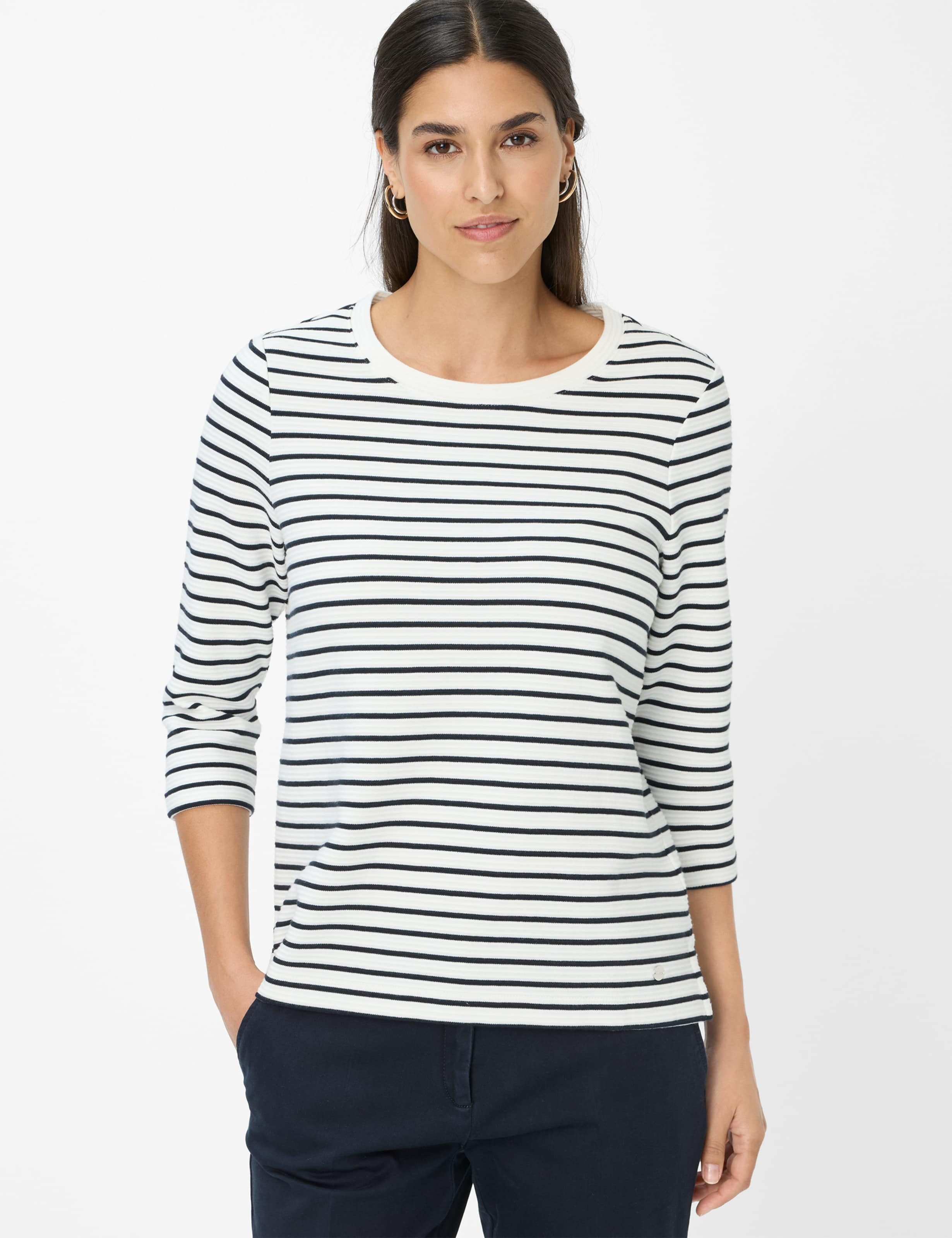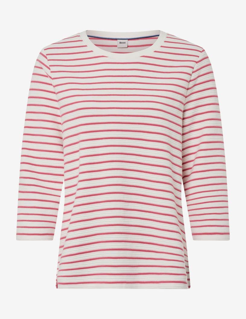 Das Brax Style Bonnie Shirt ist der ideale Begleiter für gemütliche Herbsttage. Mit seiner lässigen Oversized-Silhouette, 3/4-Ärmeln und dem klassischen Rundhalsausschnitt strahlt es entspannte Eleganz aus, die sich vielseitig kombinieren lässt. Feine Querstreifen verleihen dem Design eine moderne Dynamik, während kleine Saumschlitze charmante Details setzen. Gefertigt aus hochwertiger Baumwolle, bietet es angenehmen Tragekomfort und natürliche Atmungsaktivität, die den ganzen Tag über für Wohlbefinden sorgt.