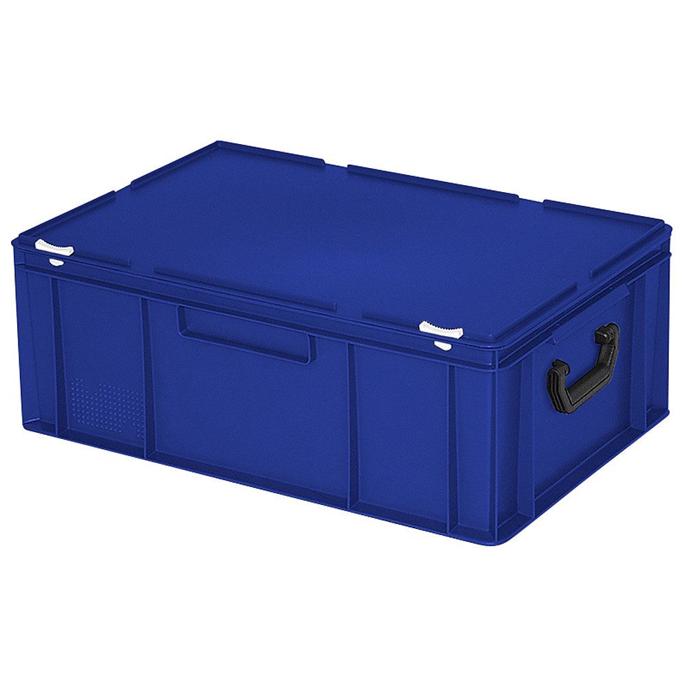 Der Eurokoffer ist schlagfest, robust und formstabil. Kältebeständig bis -40°C, hitzebeständig bis +60°C. Resistent gegen viele Säuren, Laugen und Fette. Der Aufbewahrungskoffer ist bestens geeignet für Werkzeuge, Kleinteile und andere Waren für Transport und Versand. Deckel mit Scharnieren und 2 Schiebeverschlüssen. Der Koffer verfügt über seitliche Griffleisten sowie jeweils 1 Tragegriff auf den Stirnseiten zum leichten Tragen und ist auf Euro- und Industriepaletten Maße abgestimmt. Glatte Innenwände ermöglichen eine leichte und hygienische Reinigung des Behälters. Die Eurobox und der Deckel sind aus hochwertigem, lebensmittelechtem Kunststoff hergestellt (Eurobox Polyethylen-Kunststoff (PE-HD), Deckel Polypropylen-Kunststoff (PP).
