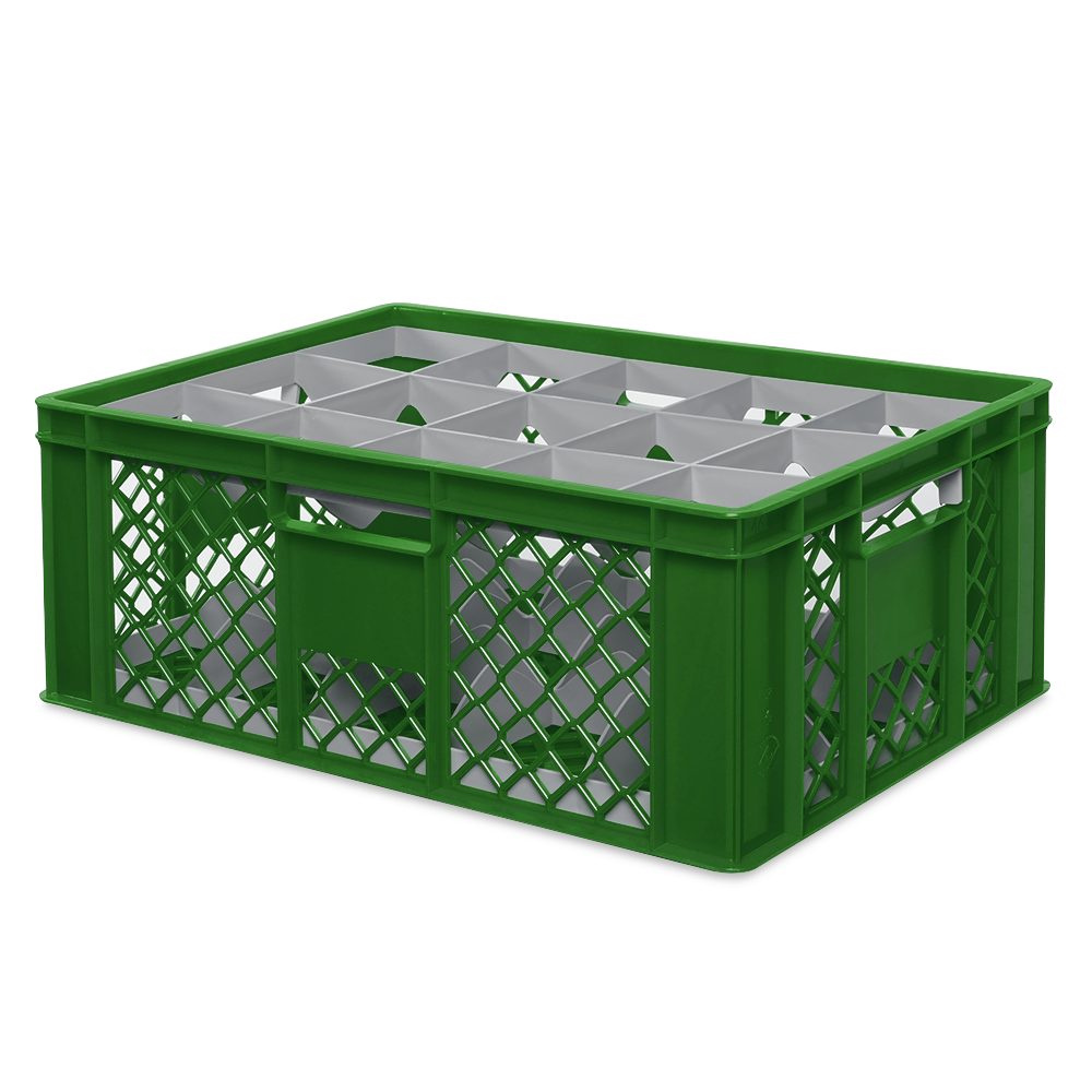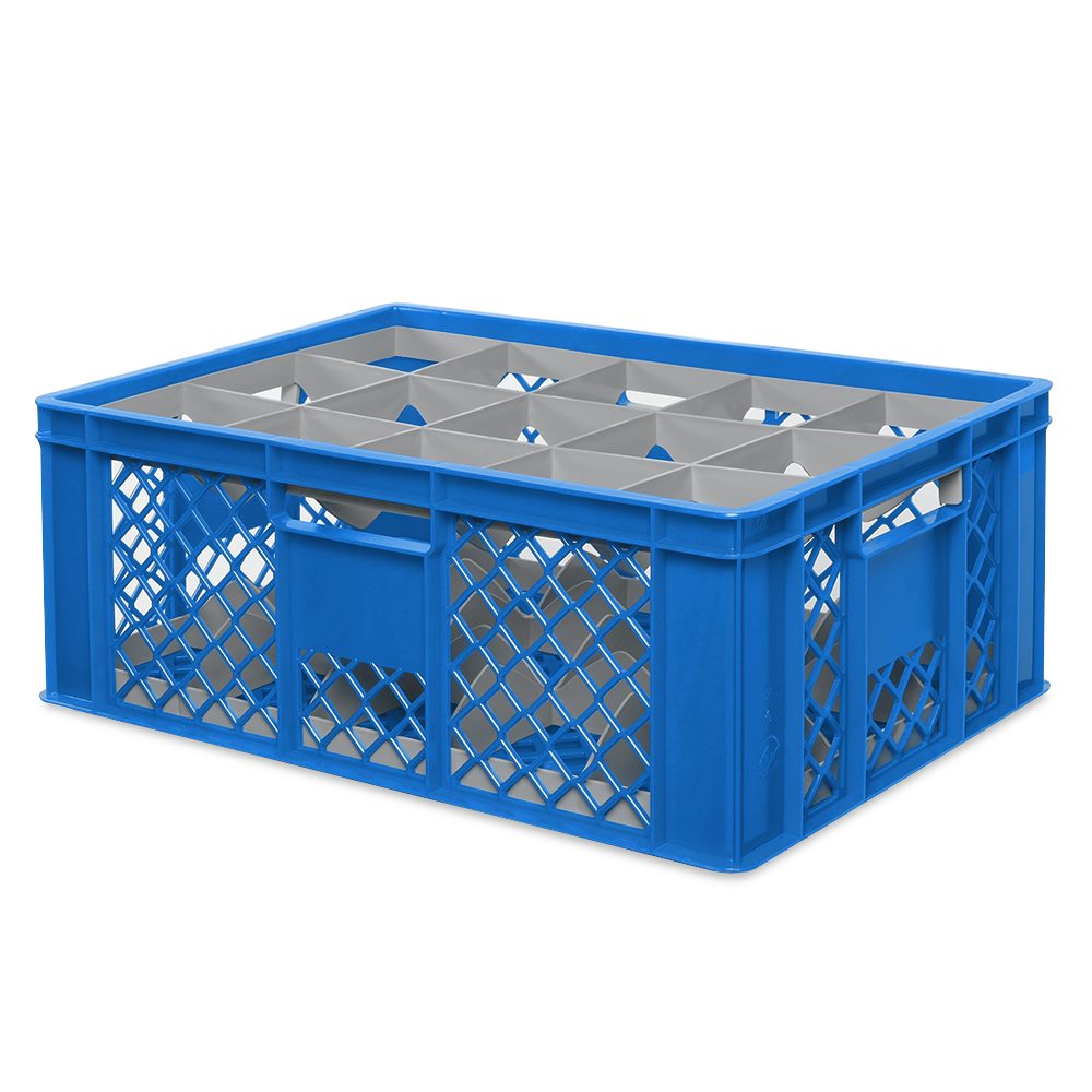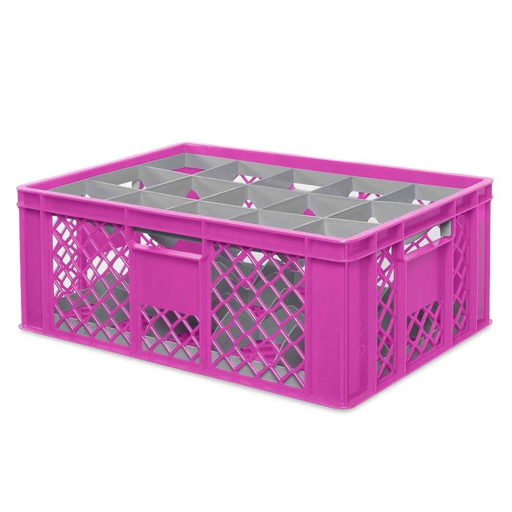 Die farbige Gläserkiste im Euromaß 600x400x240 mm bietet Platz für 15 Gläser und ist in 9 verschiedenen Farben erhältlich. Mit Einsätzen zur Unterteilung für Gläser bis zu einer Höhe von 205 mm, eignet sie sich ideal zur übersichtlichen Lagerung, Reinigung und Transport von Gläsern und Krügen. Der durchbrochene Gläserkorb aus lebensmittelechtem Polyethylen-Kunststoff ist spülmaschinenfest und verfügt über 4 praktische Durchfassgriffe für einfaches Handling. Geeignet für den Einsatz in Gastro-Spülmaschinen und passend zu allen Euronorm-Behältern. Gefachgrößen für Gläser bis 205 mm max. Höhe (Höhe der Gläserkiste 240 mm) 15 Gläser - Lichtes Fachmaß LxB 109x117 mm - Glas Durchmesser max. 109 mm