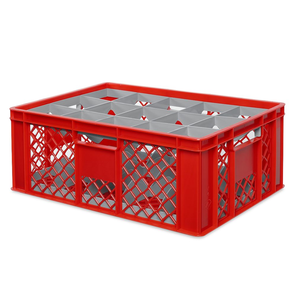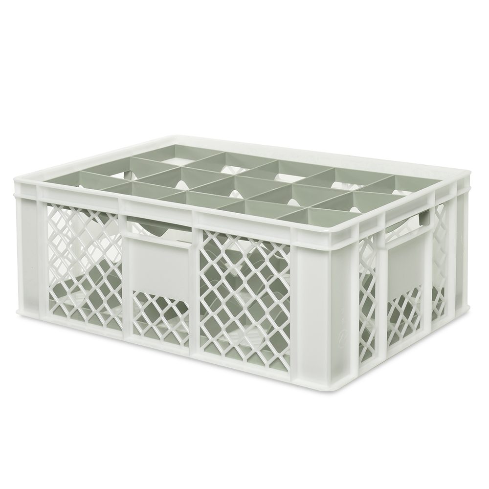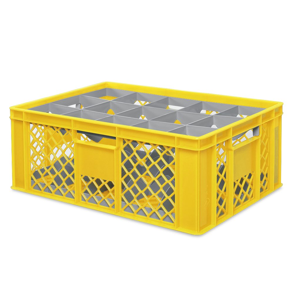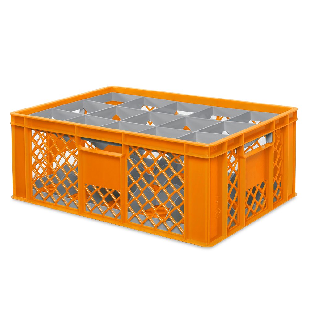 Die farbige Gläserkiste im Euromaß 600x400x240 mm bietet Platz für 15 Gläser und ist in 9 verschiedenen Farben erhältlich. Mit Einsätzen zur Unterteilung für Gläser bis zu einer Höhe von 205 mm, eignet sie sich ideal zur übersichtlichen Lagerung, Reinigung und Transport von Gläsern und Krügen. Der durchbrochene Gläserkorb aus lebensmittelechtem Polyethylen-Kunststoff ist spülmaschinenfest und verfügt über 4 praktische Durchfassgriffe für einfaches Handling. Geeignet für den Einsatz in Gastro-Spülmaschinen und passend zu allen Euronorm-Behältern. Gefachgrößen für Gläser bis 205 mm max. Höhe (Höhe der Gläserkiste 240 mm) 15 Gläser - Lichtes Fachmaß LxB 109x117 mm - Glas Durchmesser max. 109 mm