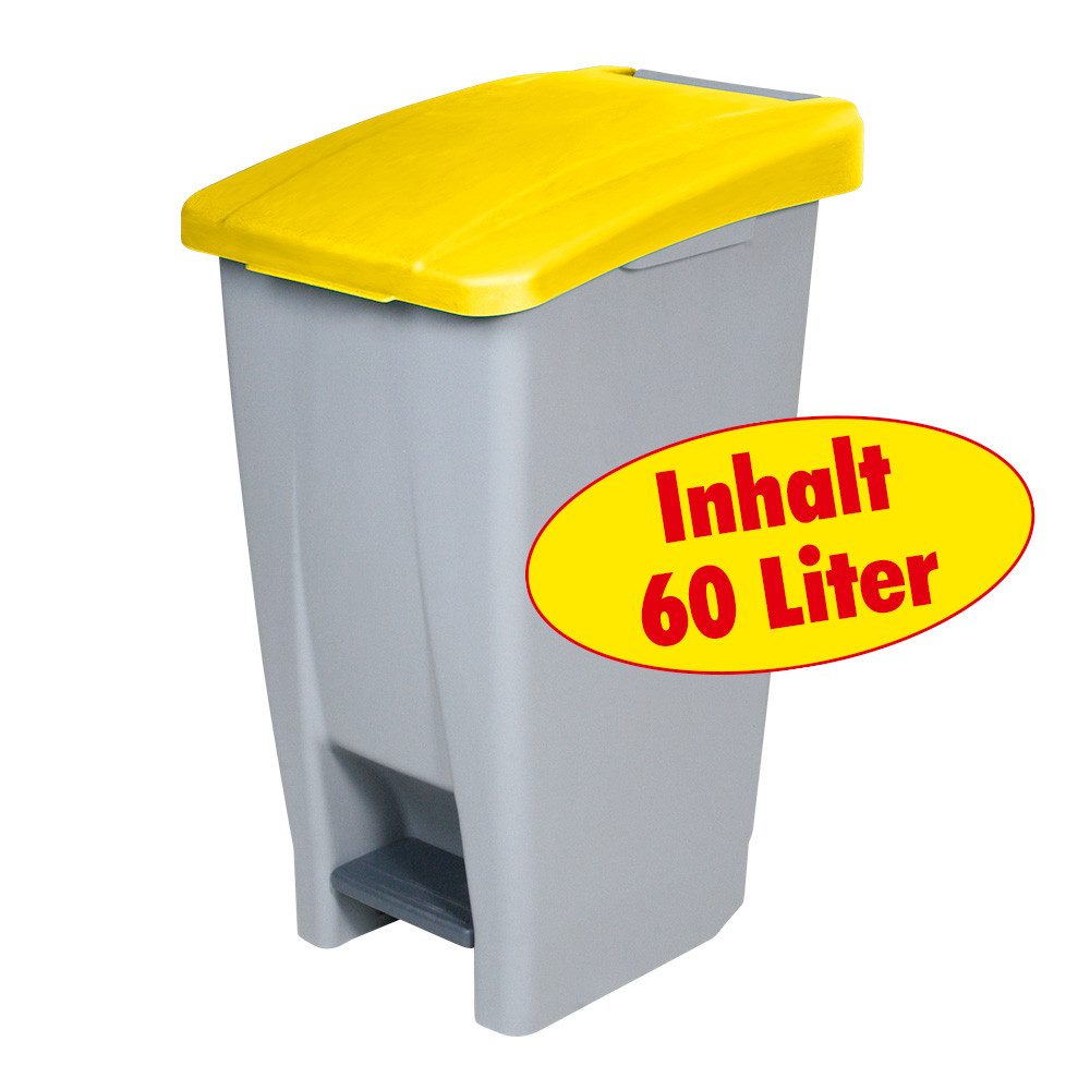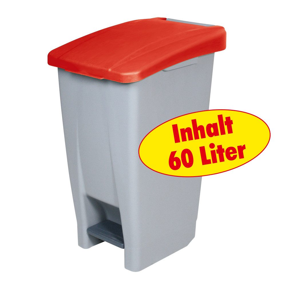 Dieser fahrbare Tret-Abfallbehälter aus Polypropylen-Kunststoff (PP) ist ideal für den Innen- und Außenbereich geeignet. Der Scharnierdeckel wird mit einem Fußpedal geöffnet und schließt automatisch. Der Deckel kann auch per Hand vollständig umgeklappt werden. Mit einem praktischen Handgriff und 2 Rollen ist der Behälter leicht zu transportieren. Die farbigen Deckel ermöglichen eine einfache Mülltrennung. Der Behälter hat ein Fassungsvermögen von 60 Litern und die Maße BxTxH 380x490x700 mm. Ideal für den Einsatz im Lager, im Handwerk, in der Lebensmittelindustrie, in Bäckereien, im Geschäft oder zu Hause. Mit diesem Tret-Abfallbehälter wird Ihre Mülltrennung zum Kinderspiel.