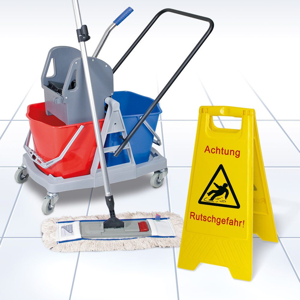 Robuster Kunststoff-Fahrwagen mit 4 leichtgängigen Lenkrollen. LxB 585x400 mm. Mit 2 abnehmbaren Eimern für Schmutz- und Frischwasser. Praktischer Schiebebügel, Gesamthöhe 850 mm. Wagen und Eimer aus Polypropylen-Kunststoff (PP). Stabile Mopp-Presse aus rostfreiem Material wird einfach aufgesetzt. Bodenwischer mit Aluminium-Teleskopstiel (800 bis 1450 mm), Kunststoff-Mopphalter mit flexiblem 360°-Drehgelenk. Einfaches Öffnen durch roten Fußdruckknopf. Profi-Wischmopp mit hohem Baumwollanteil. Dieser Reinigungswagen mit Zubehör eignet sich hervorragend für große Flächen wie Geschäftsräume und Büros. Zusätzlich erhalten Sie noch ein Warnschild (HxB 600x300 mm, zusammenklappbar, aus schlagfestem Kunststoff) mit der Aufschrift "Achtung Rutschgefahr!"
