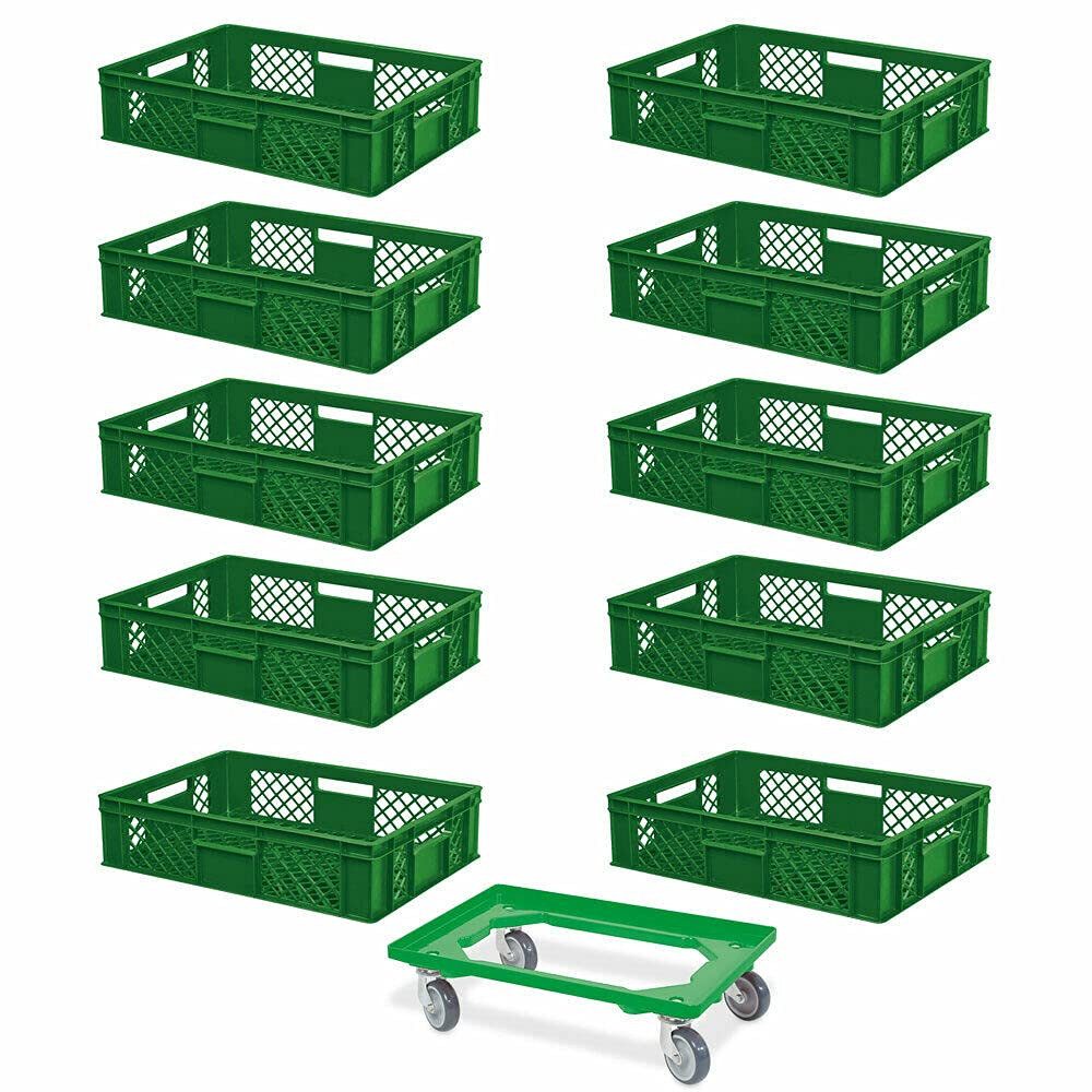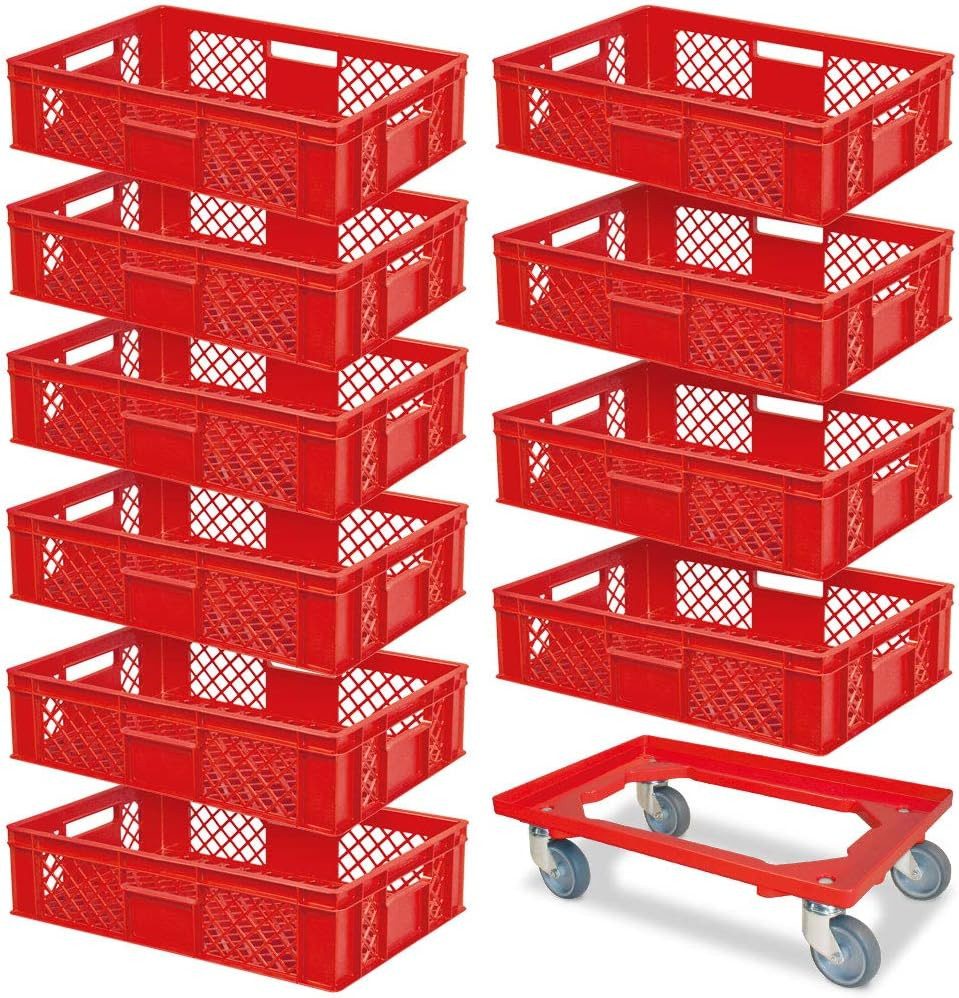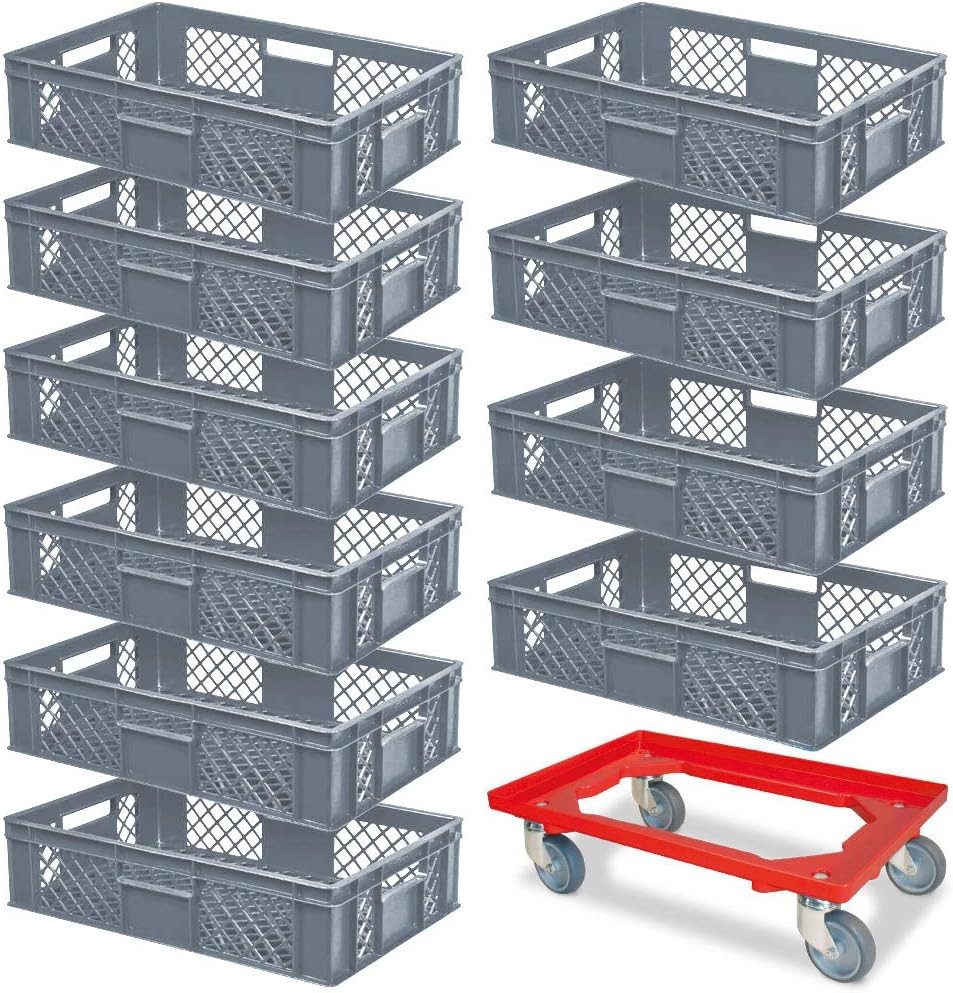Set bestehend aus 10 Eurobehältern/Bäckerkisten 600x400x150 mm + Transportroller 600x400 mm. Stapelkorb aus Polyethylen-Kunststoff (PE-HD). Bestens geeignet zum sicheren und platzsparenden Lagern und Transportieren von Waren. Der stapelbare Korb wird aus hochwertigem, lebensmittelechtem Kunststoff hergestellt und kann somit auch für Transporte von unverpackten Lebensmitteln verwendet werden. Die flüssigkeits- und luftdurchlässige Konstruktion gewährleistet eine optimale Luftzirkulation und ist darüber hinaus leicht. Stabile Stapelränder, eine hohe Formstabilität sowie zwei komfortable Handgriffe zeichnen diesen Stapelkorb aus. Der durchbrochene Kunststoffbehälter ist spülmaschinenfest, kältebeständig bis -40ºC, hitzebeständig bis +60ºC und gegen viele Chemikalien beständig. Leichte und hygienische Reinigung. Inhalt 27 Liter