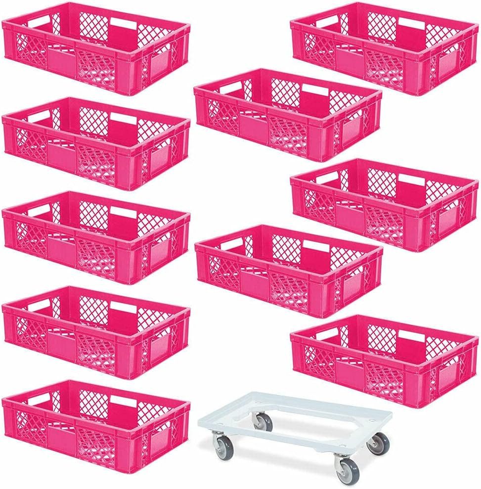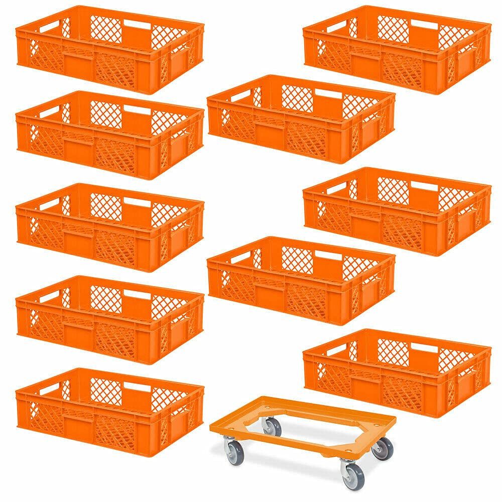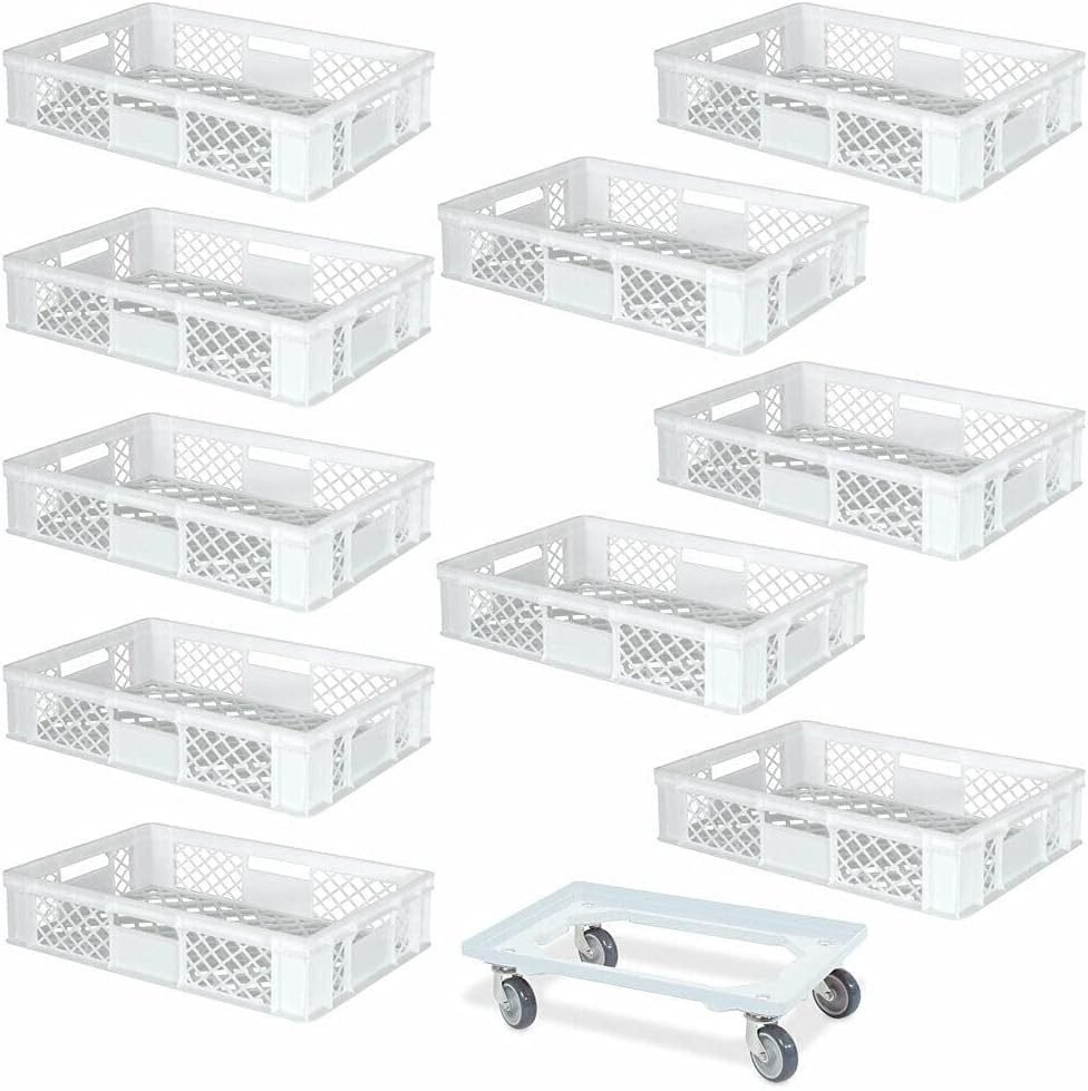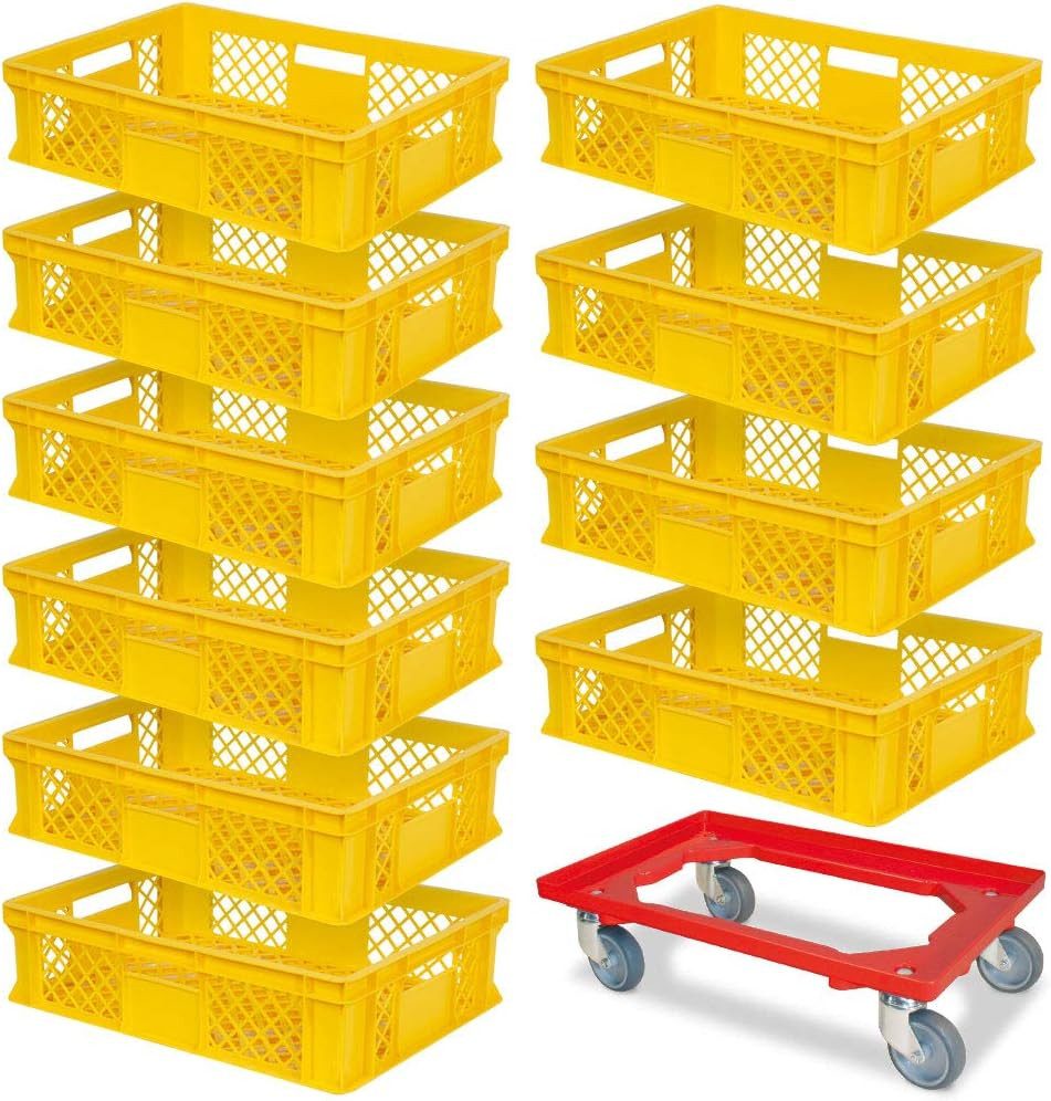 Set bestehend aus 10 Eurobehältern/Bäckerkisten 600x400x150 mm + Transportroller 600x400 mm. Stapelkorb aus Polyethylen-Kunststoff (PE-HD). Bestens geeignet zum sicheren und platzsparenden Lagern und Transportieren von Waren. Der stapelbare Korb wird aus hochwertigem, lebensmittelechtem Kunststoff hergestellt und kann somit auch für Transporte von unverpackten Lebensmitteln verwendet werden. Die flüssigkeits- und luftdurchlässige Konstruktion gewährleistet eine optimale Luftzirkulation und ist darüber hinaus leicht. Stabile Stapelränder, eine hohe Formstabilität sowie zwei komfortable Handgriffe zeichnen diesen Stapelkorb aus. Der durchbrochene Kunststoffbehälter ist spülmaschinenfest, kältebeständig bis -40ºC, hitzebeständig bis +60ºC und gegen viele Chemikalien beständig. Leichte und hygienische Reinigung. Inhalt 27 Liter