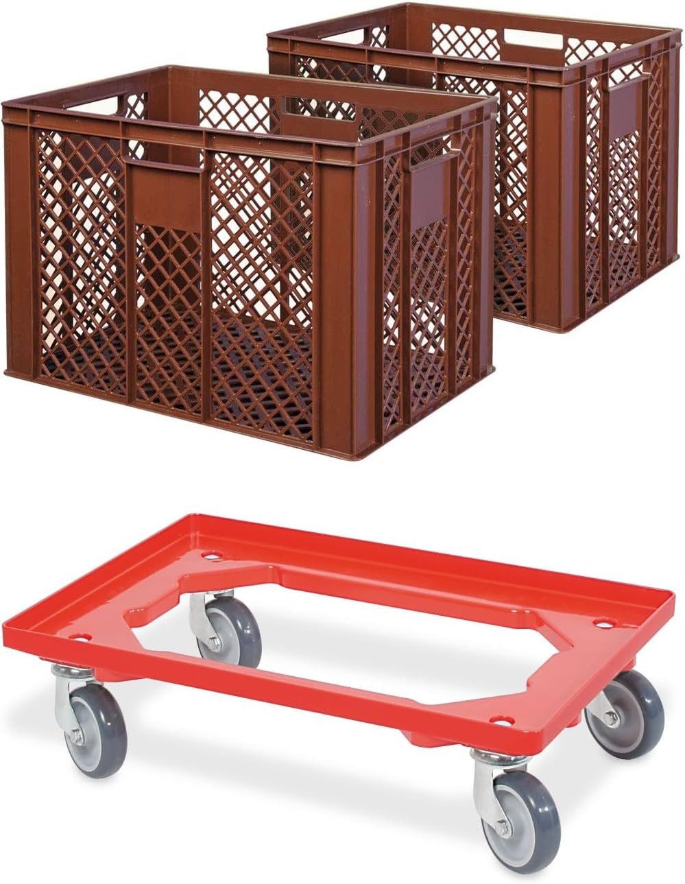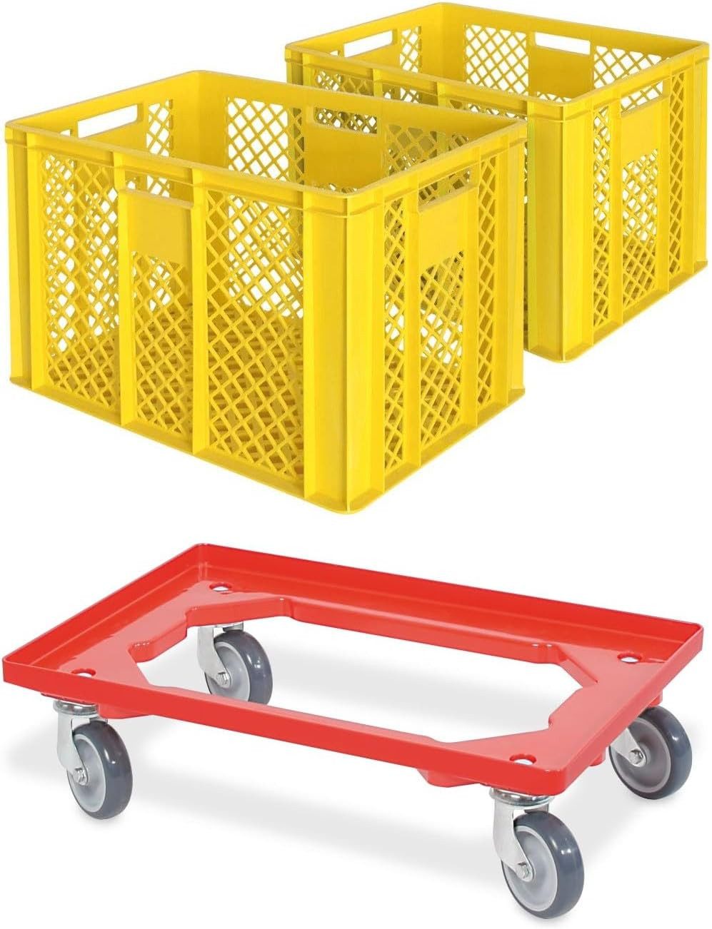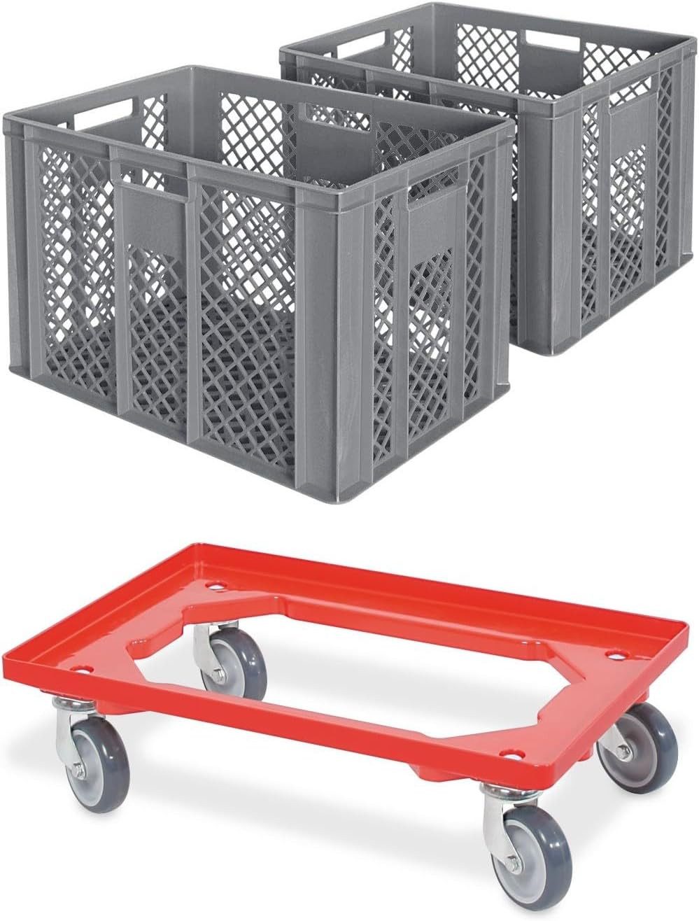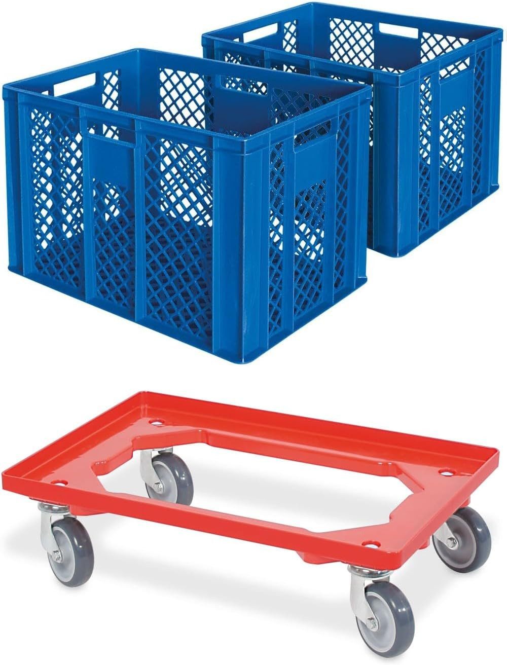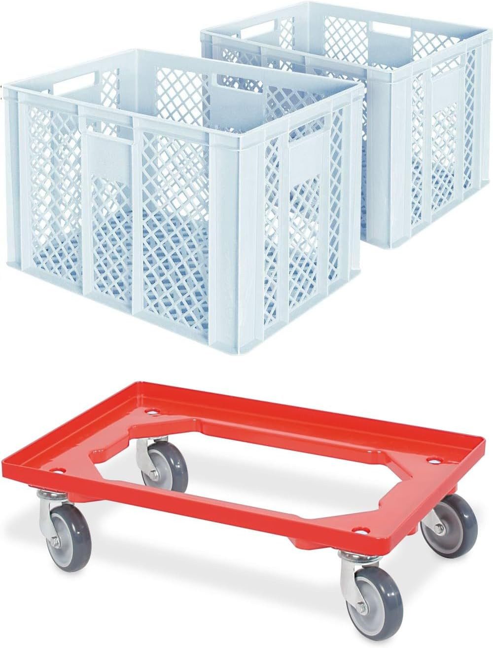 Set bestehend aus 2 Eurobehältern/Bäckerkisten 600x400x410 mm + Transportroller 600x400 mm. Stapelkorb aus Polyethylen-Kunststoff (PE-HD). Bestens geeignet zum sicheren und platzsparenden Lagern und Transportieren von Waren. Der stapelbare Korb wird aus hochwertigem, lebensmittelechtem Kunststoff hergestellt und kann somit auch für Transporte von unverpackten Lebensmitteln verwendet werden. Die flüssigkeits- und luftdurchlässige Konstruktion gewährleistet eine optimale Luftzirkulation und ist darüber hinaus leicht. Stabile Stapelränder, eine hohe Formstabilität sowie zwei komfortable Handgriffe zeichnen diesen Stapelkorb aus. Der durchbrochene Kunststoffbehälter ist spülmaschinenfest, kältebeständig bis -40ºC, hitzebeständig bis +60ºC und gegen viele Chemikalien beständig. Leichte und hygienische Reinigung. Inhalt 83 Liter