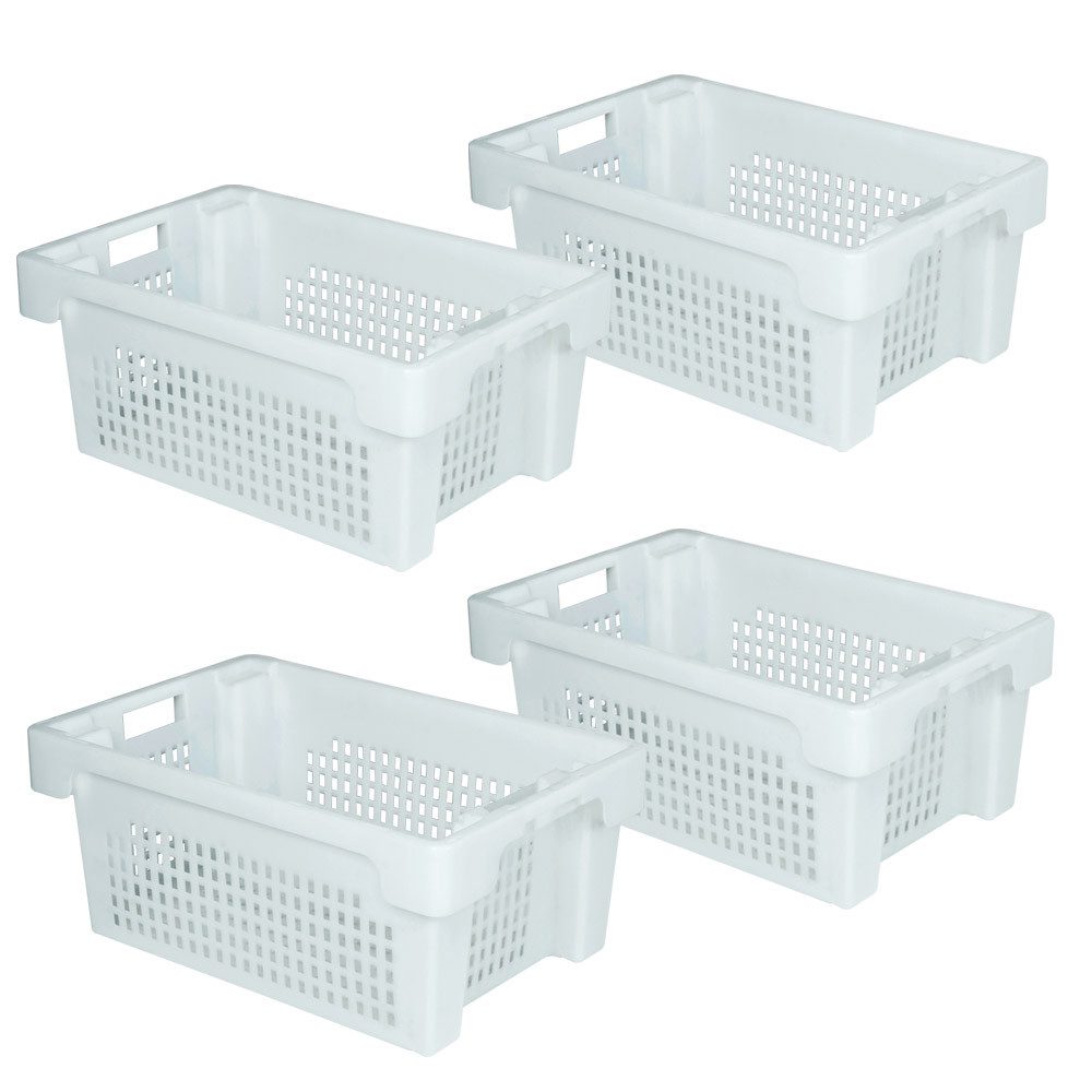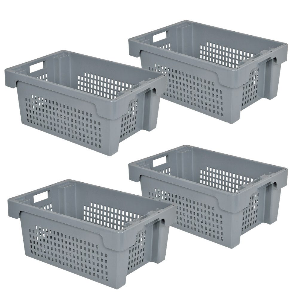 Die Drehstapelbehälter mit den Maßen 600x400x250 mm und einem Fassungsvermögen von 40 Litern sind eine praktische Lösung für platzsparendes Lagern und Transportieren. Durch das ineinander stellen der leeren Behälter lassen sich Raum und Kosten beim Rücktransport erheblich reduzieren. Die durchbrochenen Wände und Böden sorgen für eine gute Belüftung der gelagerten Waren, während die handgerechten, stabilen Griffe eine einfache Handhabung ermöglichen. Die innen abgerundeten Gitter minimieren das Risiko von Beschädigungen empfindlicher Güter wie z.B. Früchte während des Transports. Hergestellt aus langlebigem Polyethylen-Kunststoff (PE-HD), sind die Behälter kältebeständig bis -40ºC, hitzebeständig bis +60ºC und spülmaschinenfest. Mit Innenmaßen von 520x360x245 mm wiegen sie nur 1,8 kg und eignen sich ideal für vielfältige Einsatzbereiche.