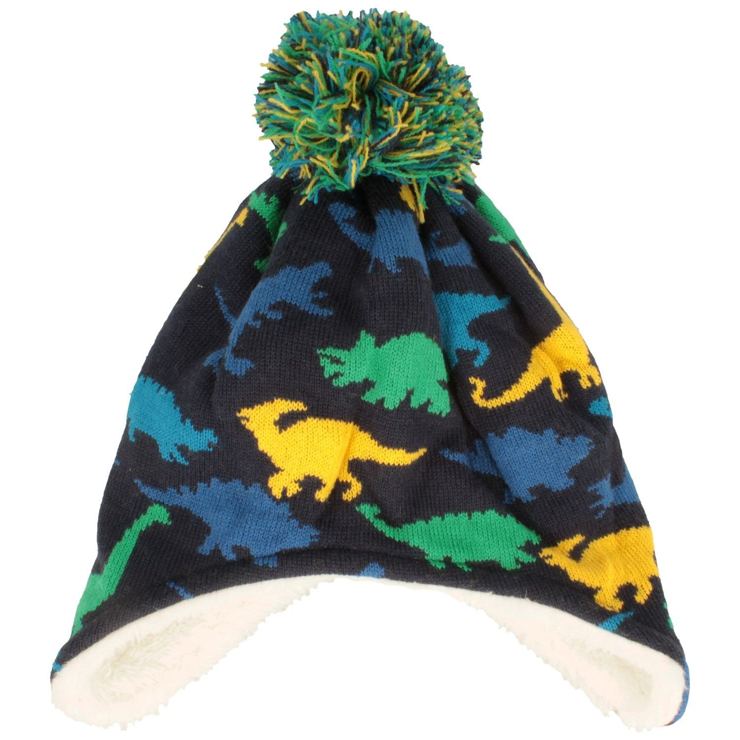 - Warme Hut-Breiter Winter-Mütze für kleine Dino-Fans mit Ohrenschutz, Dinosauriern, kuschligem Plüsch-Innenfutter & buntem Bommel