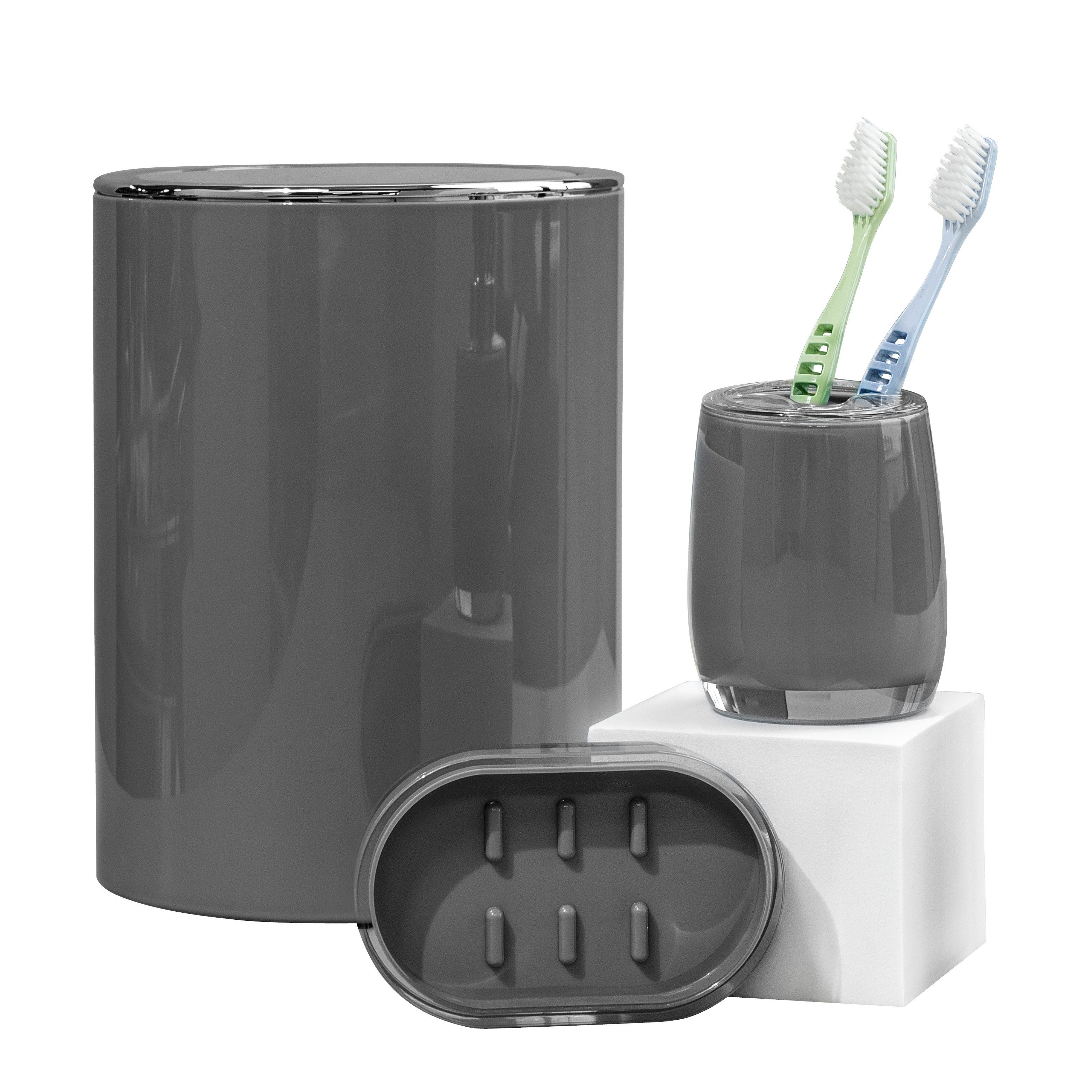 Die Vorteile auf einem Blick * glatte Oberfläche für leichte Pflege und Hygiene * Eimer mit Schwingdeckel und 5,5 Liter Volumen * 4 Schutzpads am Boden des Eimers verhindern Kratzspuren * inkl. Beutelring zur Befestigung der Mülltüte * Zahnputzbecher mit abnehmbarem Deckel * Seifenschale mit Rippen-Oberfläche * Material: aus Kunststoff, Deckelring verchromt, grau * Abmessungen (B/H/T): Kosmetikeimer: ca. 19 x 24,5 x 19 cm, Zahnbutzbecher: ca. 8 x 10 x 8 cm, Seifenschale: ca. 13 x 2,5 x 8 cm