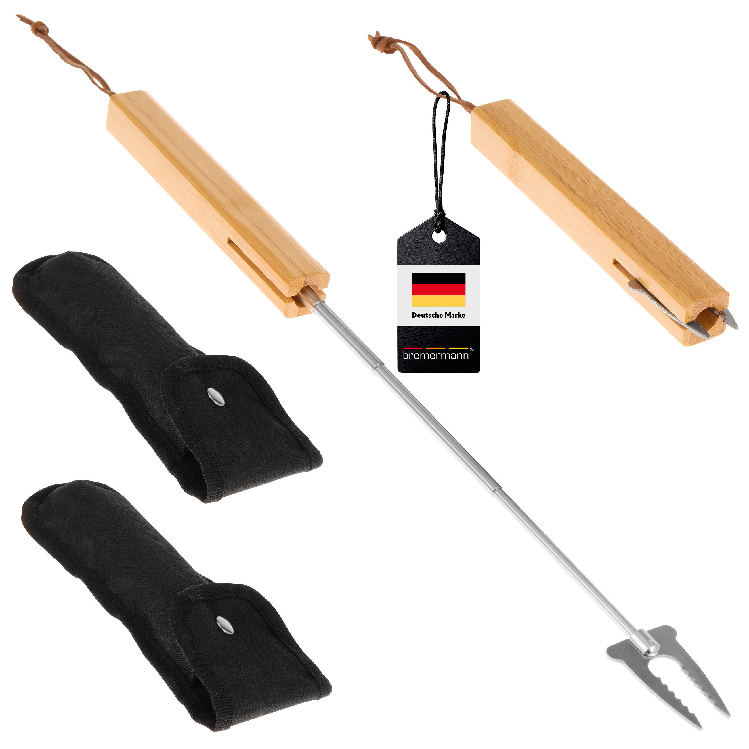 - Stück ausziehbare Teleskop-Grillgabeln - jede Gabel inkl. Tasche für eine ordentliche Aufbewahrung und das Tragen am Gürtel - für eine sichere Handhabung und genügend Abstand zum heißen Grill - die Grillgabel kann einzeln aufgehängt werden - durch die Teleskop-Funktion sehr platzsparend zu verstauen - starke Materialkombination: Edelstahl mit Bambusgriffen - nicht für die Spülmaschine geeignet - Material: Teleskop und Gabel rostfreier Edelstahl, Bambus, Tasche 100 % Polyester - Abmessungen: Grillgabel ca. 80,5 cm lang Grillgabel eingezogen ca. 2,2 x 17,5 cm (B/H) Tasche ca. 8 x 20 cm (B/H)