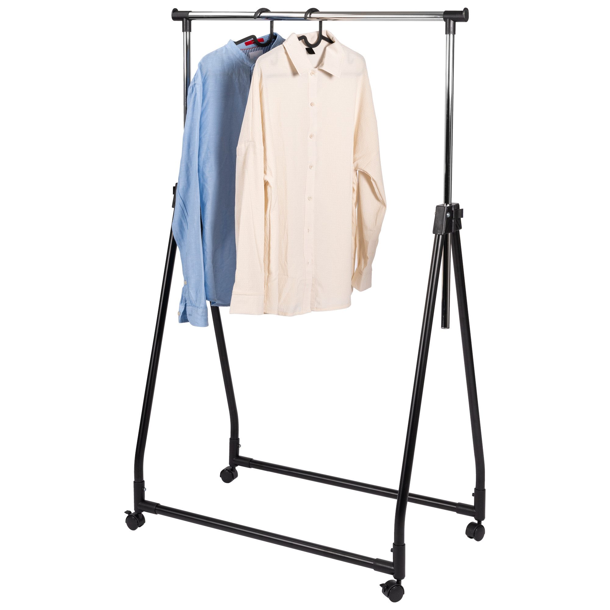 Brauchen Sie die Rollgarderobe einmal nicht, können Sie ihre Beine platzsparend zusammenklappen. Sie ist dann so schmal, dass Sie durchaus auch unter dem ein oder anderen Bett gelagert werden könnte. Für den nächsten Einsatz brauchen Sie den Kleiderwagen dann einfach nur aufklappen und es kann losgehen. Ihr Kleiderwagen auf Rollen soll mobil sein aber nicht immer. Darum haben 2 der 4 Möbelrollen eine Feststellbremse.
