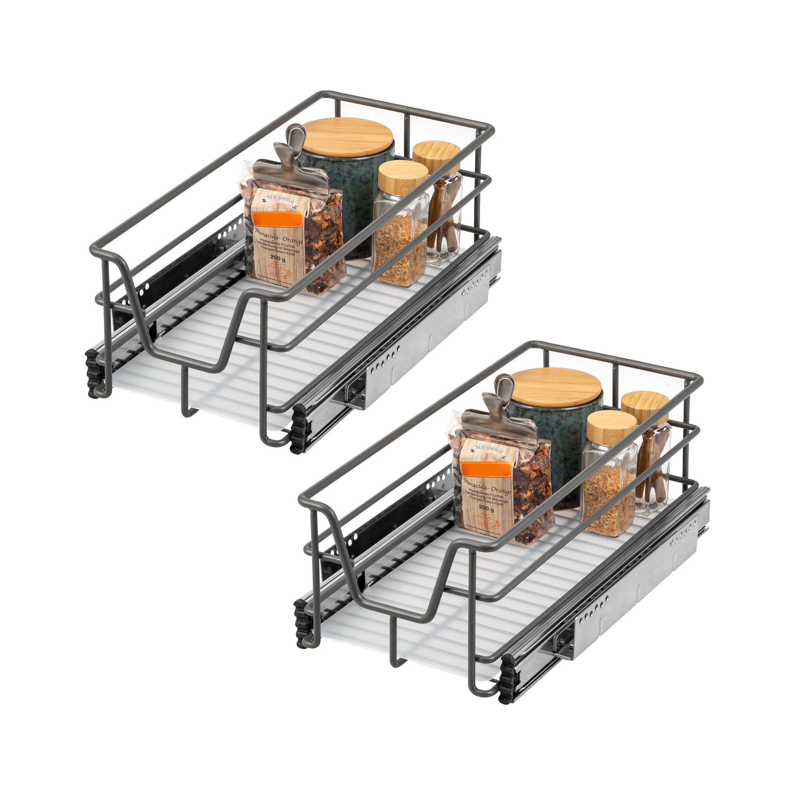 Zwei ideale Nachrüst-Schubladen für gängige Küchenschränke mit einer Schrankbreite (Außenmaß) von 30 cm. Mit Teleskop-Vollauszug für vollständigen Zugriff und Sicht im Schrank.