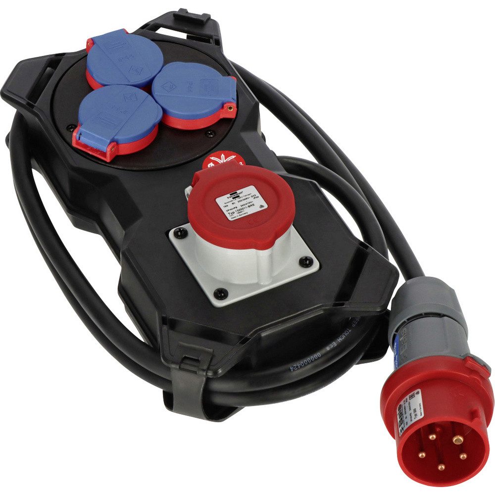 Wandverteiler mit CEE-Stecker (400V/16A), 1 CEE-Steckdose (400V/16A) und 3 Schutzkontakt-Steckdosen (230V/16A, auf drei Phasen angeschlossen)
