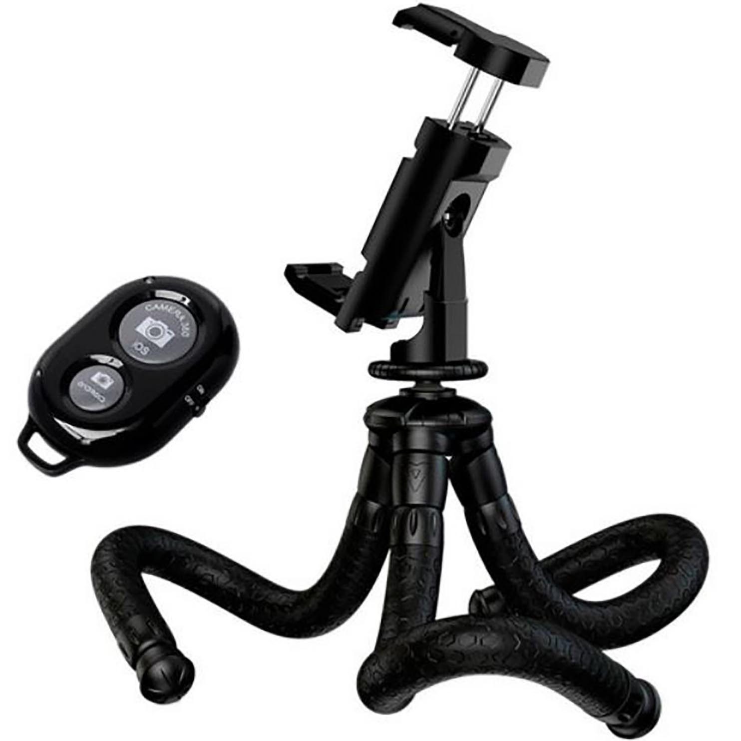 Lieferumfang | Mini-Flex-Stativ mit Kugelkopf (Beine und Füße abschraubbar), Smartphone-Halterung, Bluetooth-Fernsteuerung, Transportbeutel |