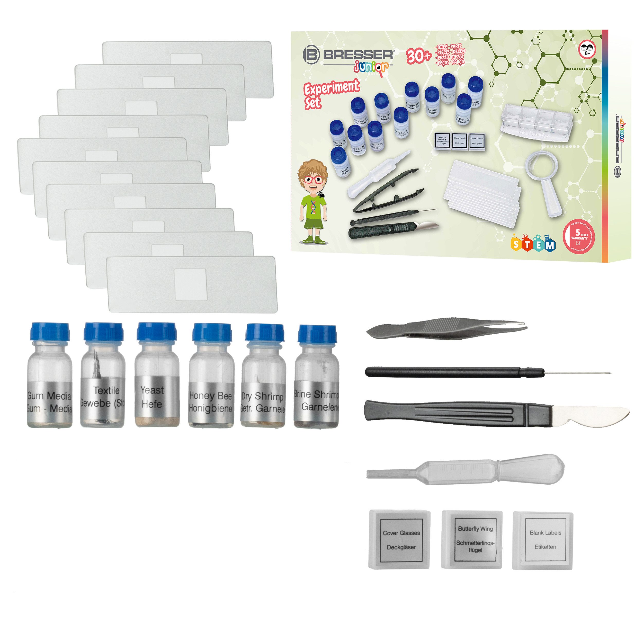 Lieferumfang | Pipette, Nicht spitze Kindernadel, Pinzette, Lupe, Objektträger, Deckgläser, Objektgläser, Entschärftes Kinderskalpell, Garnelenbrutanlage, verschiedene Mikroskopierpräparate |