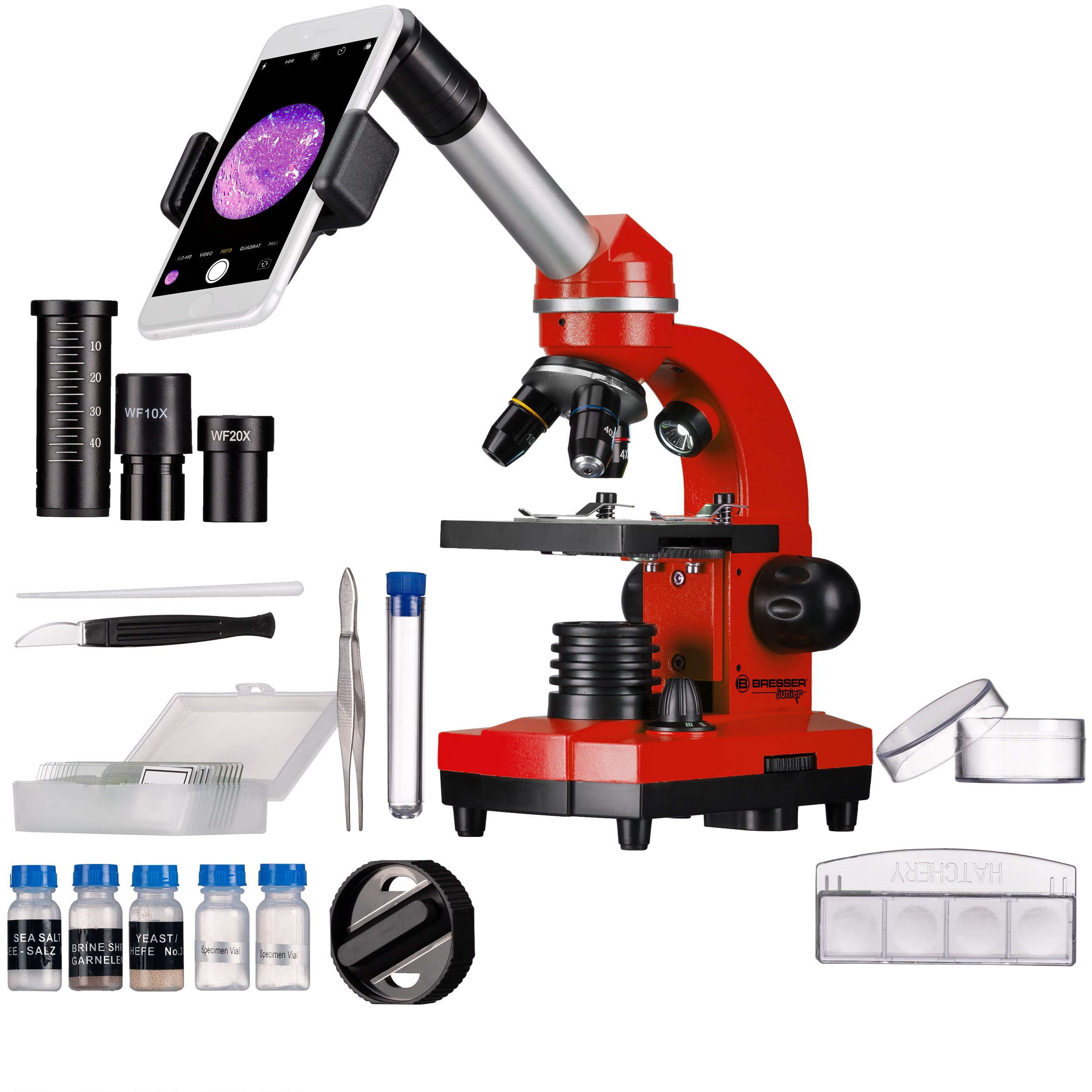 Lieferumfang | Mikroskop, 2 Weitfeld-Okulare: 10x und 20x, 3 Objektive: 4x, 10x und 40x, Barlow-Linse mit bis zu 2-facher Vergrößerung, Mikroskopierbesteck, Hefe, Seesalz, Garneleneier, Garnelenbrutanlage, Microcut-Mikrotom, leere Objektträger und Deckgläser, Dauerpräpa |
