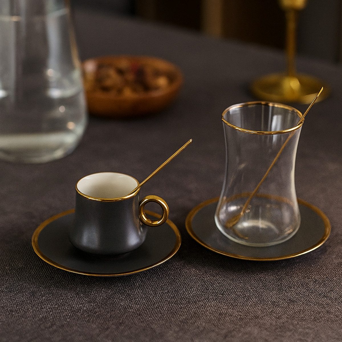 Das BRICARD Tee-Espresso Set 004 in edlem Grau besticht durch seine moderne Eleganz und stilvollen Akzente in Gold. Hergestellt aus hochwertigem Glas und Keramik, bietet es die perfekte Kombination aus Funktionalität und exklusivem Design. Ob für den morgendlichen Espresso oder eine gemütliche Teestunde – dieses Set verleiht jedem Anlass eine luxuriöse Note.