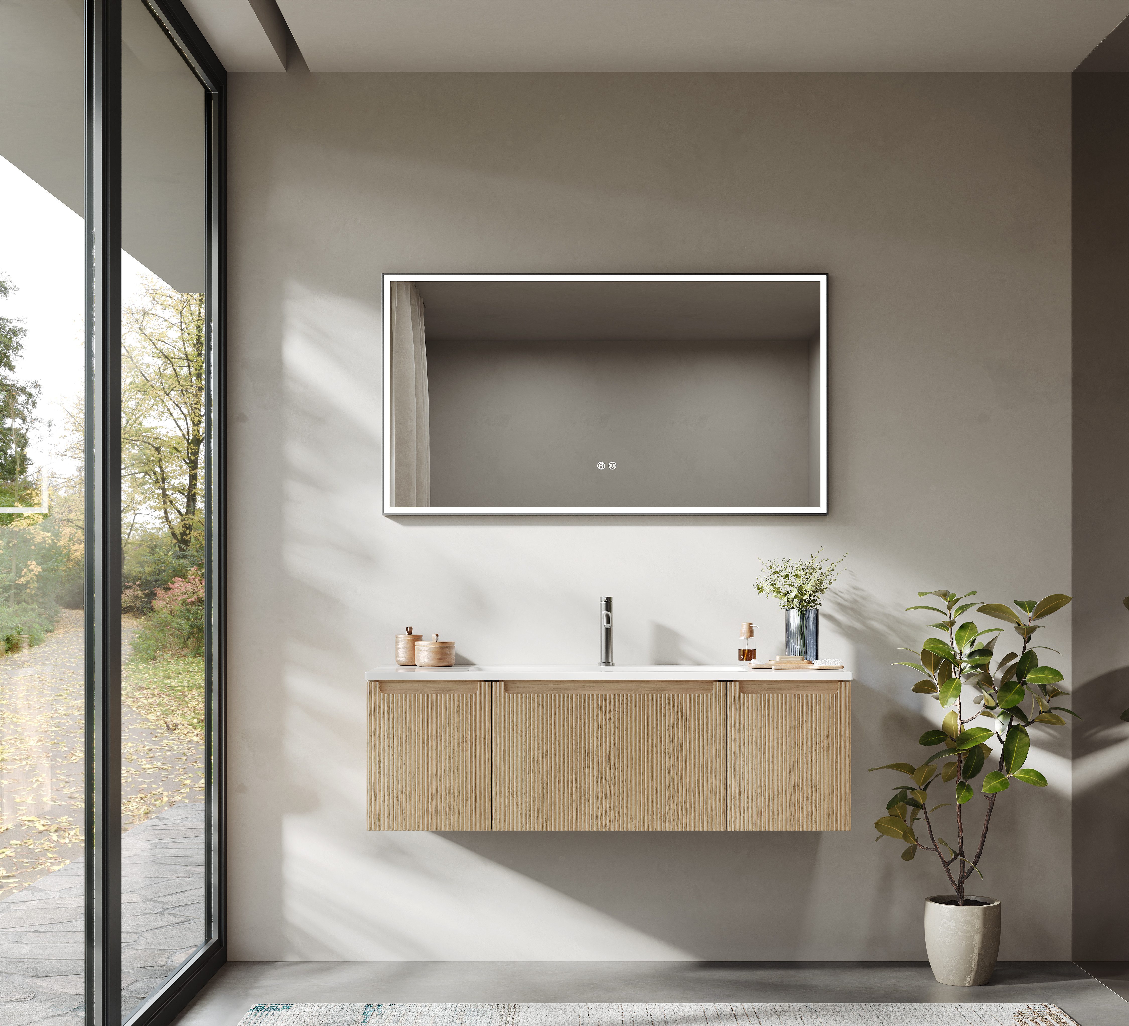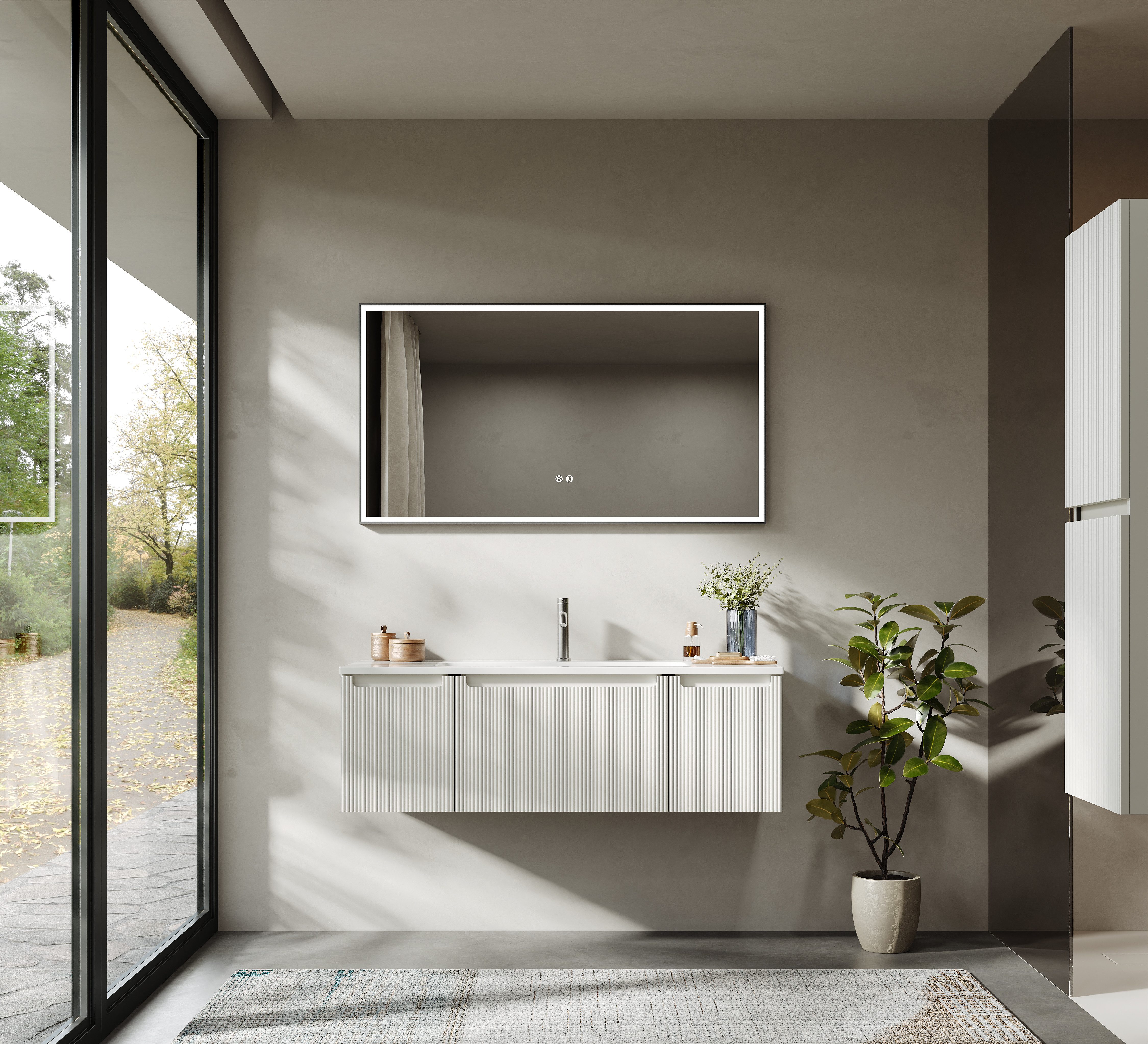 Maximieren Sie Ihren Badezimmerraum mit diesem eleganten 120 cm Wand-Waschtisch. Ausgestattet mit einem luxuriösen Mineralguss-Waschbecken bietet er großzügige Ablageflächen auf beiden Seiten für Toilettenartikel und Kosmetika. Das moderne Weiß Matt-Finish und die Reeded Fluted Türpaneele verleihen Ihrem Badezimmer eine elegante Note.