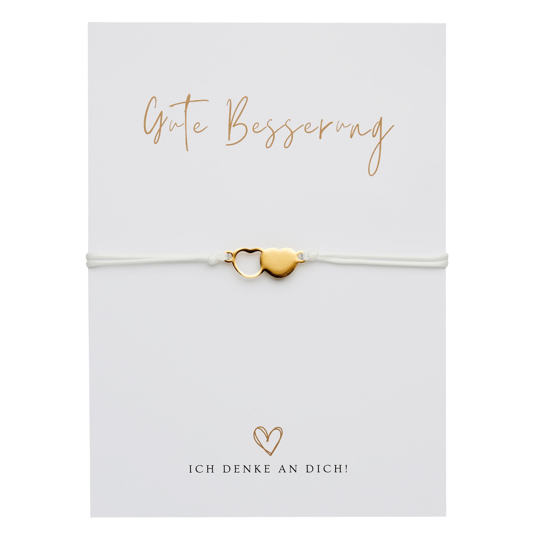 Suchst du nach einem stilvollen und bedeutungsvollen Gute Besserung Geschenk? Unser Armband-Set mit liebevoll gestalteter Gute Besserung Karte im DIN A6-Format ist genau das Richtige, um jemandem in schwierigen Zeiten Mut zu machen. Das goldene Doppelherz-Armband symbolisiert Hoffnung und Verbundenheit – ein perfekter Glücksbringer für Genesung und neue Kraft.