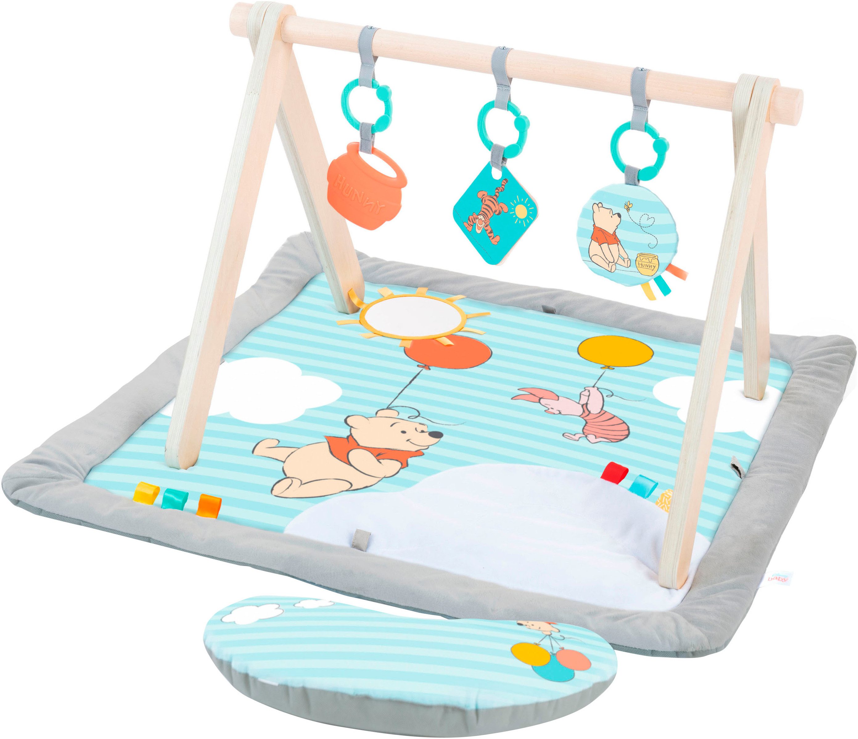 Die robuste Spielzeugstange mit A-Rahmen aus Holz enthält 3 abnehmbare Spielzeuge: eine Plüschrassel mit Bändern, Lernkarten mit Zahlen von Winnie Puuh und ein Honigtopf-Strukturspielzeug. Die Spielzeugstange ist leicht abzubauen und lässt sich bei Nichtgebrauch flach zusammenlegen,