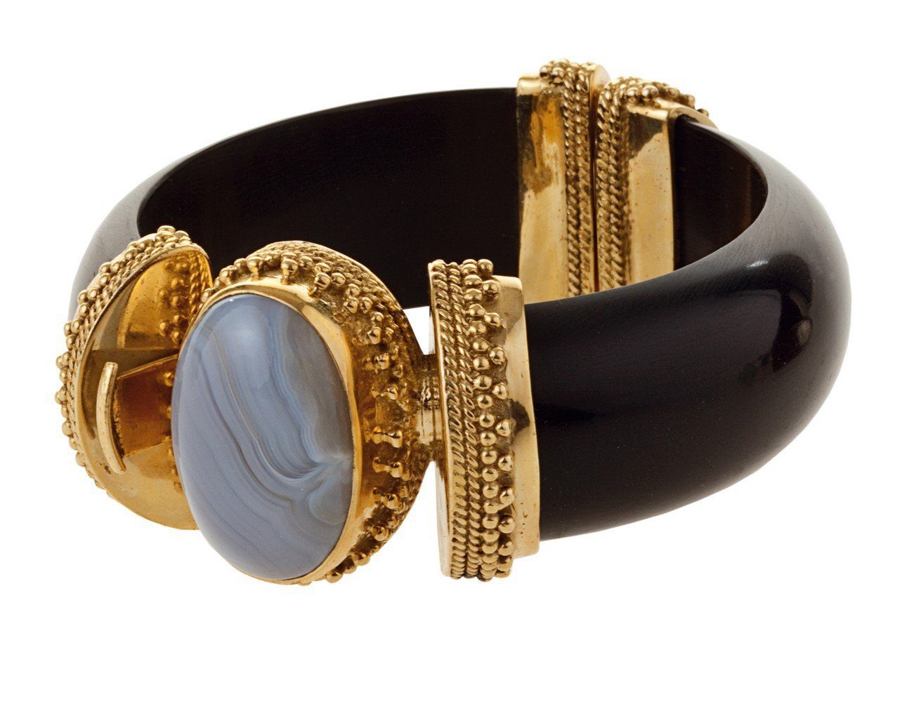 Antiker Königsschmuck zum Überstreifen. Korpus aus fein gedrechseltem, dunklem Hartholz mit Appliken aus Messing. Vorne glänzt ein gefasster Halbedelstein. schwarz, groß, ø 65 mm innen.