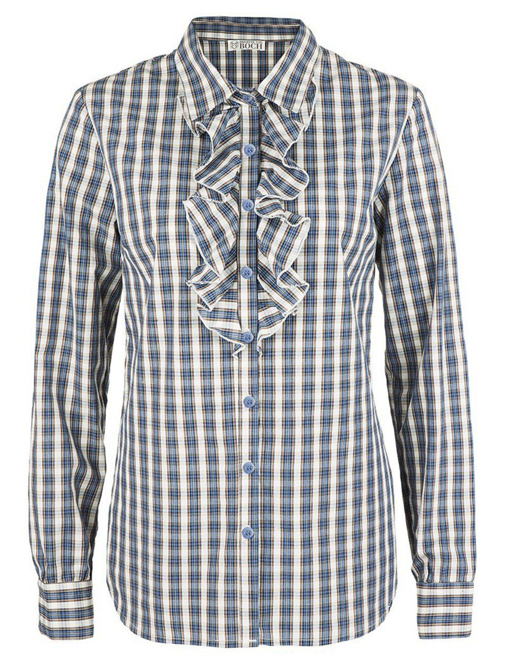 Sportlichkeit trifft femininen Chic mit dieser vielseitigen Bluse. Extravagante Damenbluse im lässigen Karo-Look mit langen Ärmeln und taillierter Passform sowie klassischem Hemdblusenkragen mit Kragensteg. Der opulente Volanteinsatz verleiht dem Outfitallrounder Raffinesse, schimmernde, blaue Druckknöpfe sowie die Manschetten mit Falte und Schlitzleiste bezeugen die Detailverliebtheit. Eine vielseitige Bluse für viele Anlässe, weit über diese Saison hinaus. Seitenschlitz und gerundeter Saum, Brustabnäher vorne. Blau/Weiß. Длина ca. 69 cm. 100% Baumwolle. Maschinenwäsche.