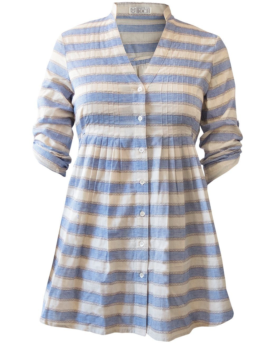 Longbluse im Empire-Stil aus Baumwolle. Stilsicher begeistert die weich fallende Tunika in femininer Empire-Linie mit vielen Details wie den zarten, weißen Webstreifen und einem feinen, grafischen Muster. Besonderer Hingucker ist der Kelchkragen mit anschließender Knopfleiste und die Logo-Perlmuttknöpfe. Auf Unterbrusthöhe ist ein Bindegürtel eingearbeitet, sodass die Longbluse mit ihren schmalen Falten in schöner A-Linie fällt und eine besonders reizvolle Silhouette zaubert. Die Ärmel können Sie je nach Look und Laune mal in ¾-Длина tragen oder mit Riegel und Knopf lässig krempeln. Mit figurformender Schulterpasse im Rückenteil. Beige/blau gestreift. Длина ca. 80 cm. 100% Baumwolle. Feinwäsche.
