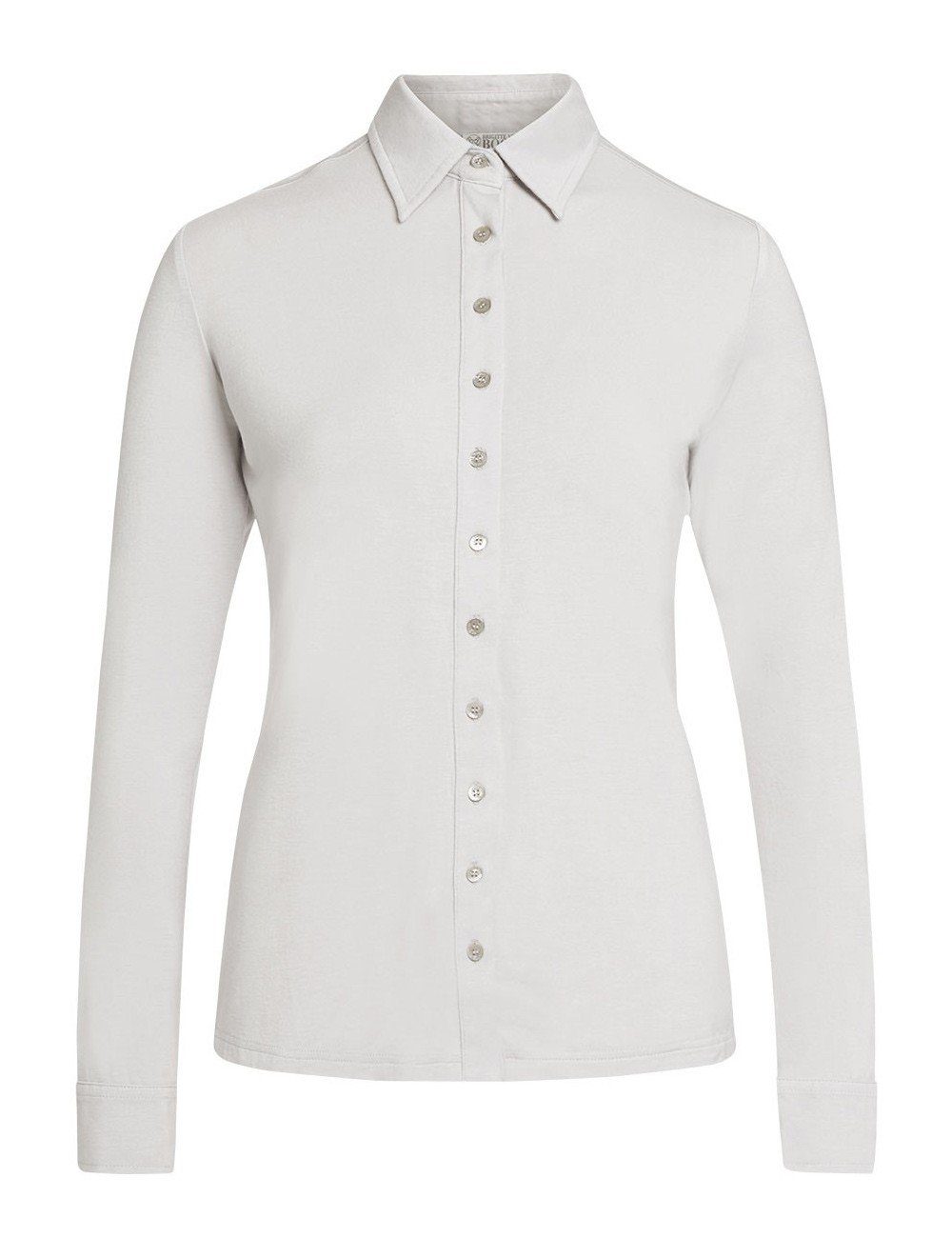 Feminine Hemdbluse mit edlen Perlmuttknöpfen. Das soft fallende Jerseyhemd punktet nicht nur mit seinem sportlich-femininen Stil, sondern auch mit einer hochwertigen Konfektionierung. Die Schulterpasse ist dekorativ abgesteppt, farblich passende Logo-Perlmuttknöpfe an der Knopfleiste und den Ärmelmanschetten setzen schimmernde Akzente. Die ideale Basic-Bluse zu schmalen Röcken und Hosen, Jeans, Blazer oder Strickjacken. Silbergrau. Длина ca. 66 cm. 95% Rayon, 5% Elasthan. Feinwäsche. Größen XS – XXL.