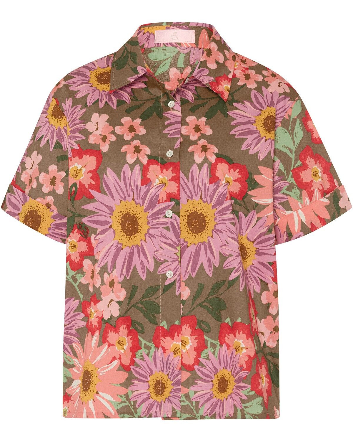 Die zeitlose Bluse im Hemdblusenstil vereint klassischen Chic mit einem frischen, farbenfrohen Blumenmuster, das jeden Look aufwertet. Dieses Design eignet sich ideal für verschiedene Anlässe, von lässigen Treffen bis hin zu eleganten Veranstaltungen. Die harmonische Farbpalette sorgt dafür, dass die Bluse mühelos mit verschiedenen Outfits kombiniert werden kann und somit ein vielseitiges Kleidungsstück im Kleiderschrank darstellt. Die überschnittenen Schultern verleihen der Bluse eine entspannte Silhouette, während die kurzen Ärmel mit Aufschlag für einen lässigen, dennoch raffinierten Look sorgen. Die Verwendung von hochwertigen Materialien garantiert nicht nur einen hohen Tragekomfort, sondern auch eine angenehme Passform, die den ganzen Tag über ein Gefühl von Leichtigkeit vermittelt. Die subtile Eleganz wird durch die feinen Knöpfe aus Perlmutt unterstrichen, die der Bluse einen Hauch von Luxus verleihen. Ob in Kombination mit Jeans für einen entspannten Alltag oder als stilvolle Ergänzung zu einem Rock für besondere Anlässe, diese Bluse ist ein Must-Have für modebewusste Frauen. Sie bietet nicht nur eine ansprechende Optik, sondern auch die Möglichkeit, den individuellen Stil auszudrücken. Die Bluse ist somit nicht nur ein Kleidungsstück, sondern ein Statement für zeitlose Eleganz und kreative Vielseitigkeit. Oberstoff: 100% Baumwolle